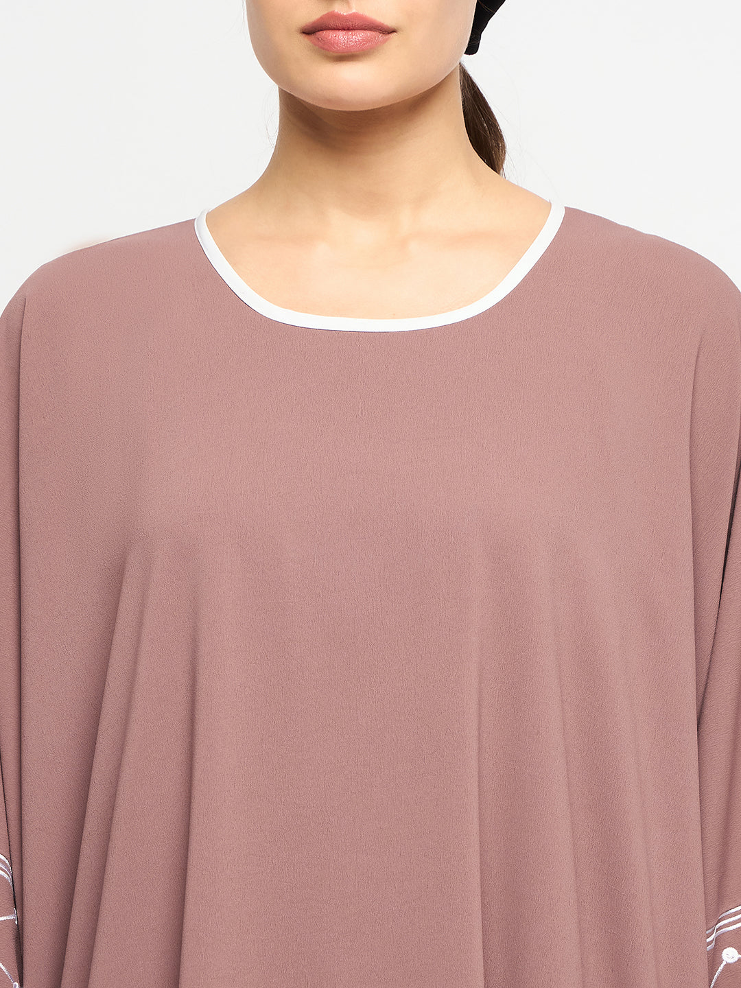 Elevate your style with the puce pink Palestine Abaya, adorned with intricate embroidery inspired by Palestinian heritage. Crafted from breathable cy crush fabric, featuring free sleeves, a round neck, and a solid pattern, this abaya embodies modesty, comfort, and cultural grace for Islamic women.