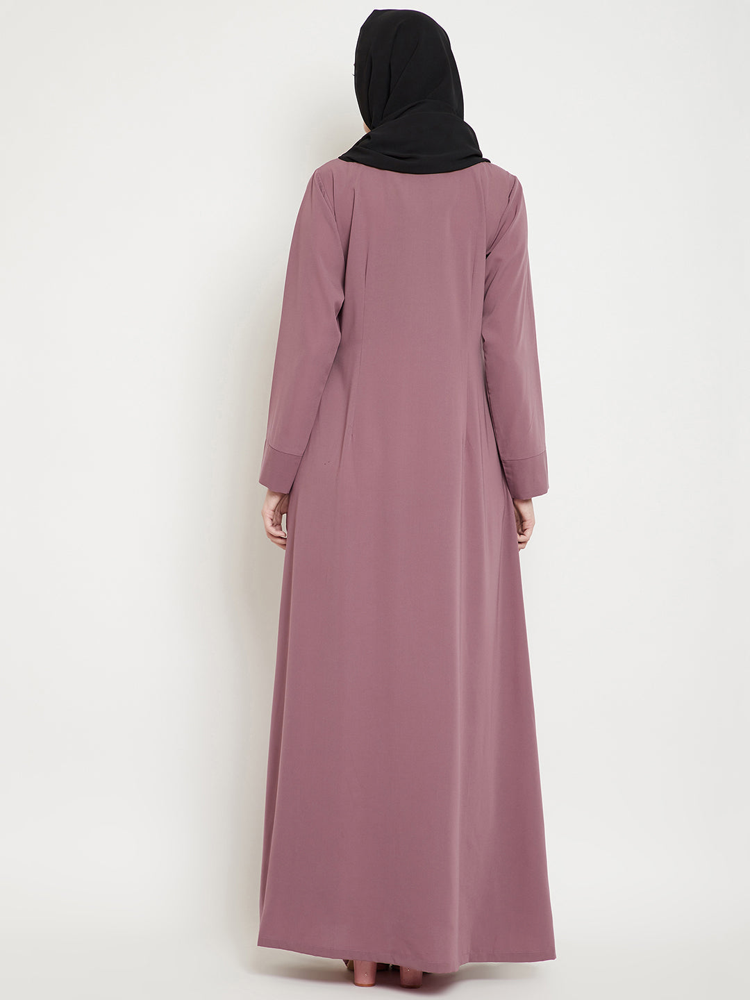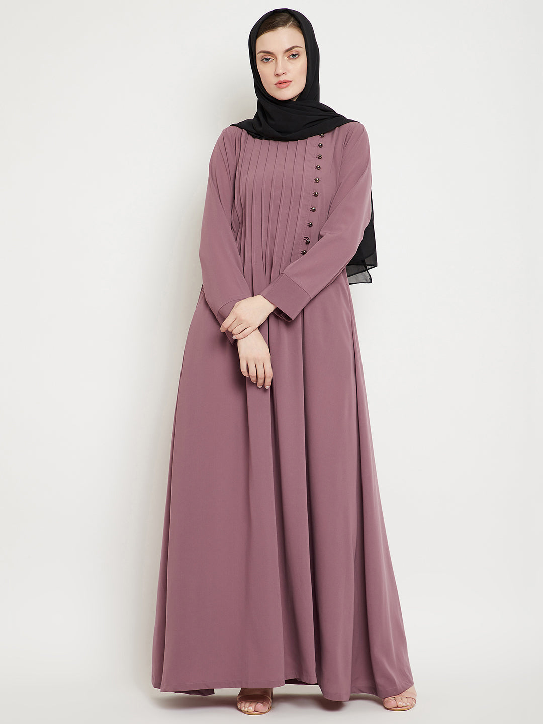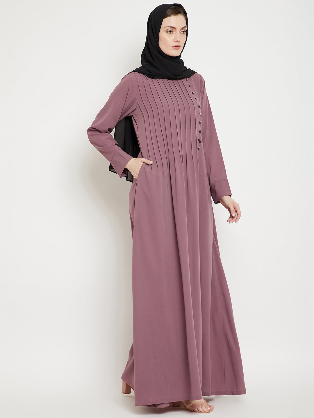 Capture the essence of contemporary fashion in this puce pink abaya. The round neck and long sleeves abaya is crafted from a Nida Matte fabric. The buttons on the side along with pleats on the front, add a graceful flow to this garment.
