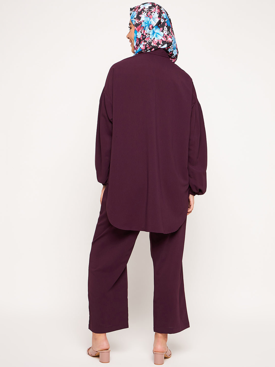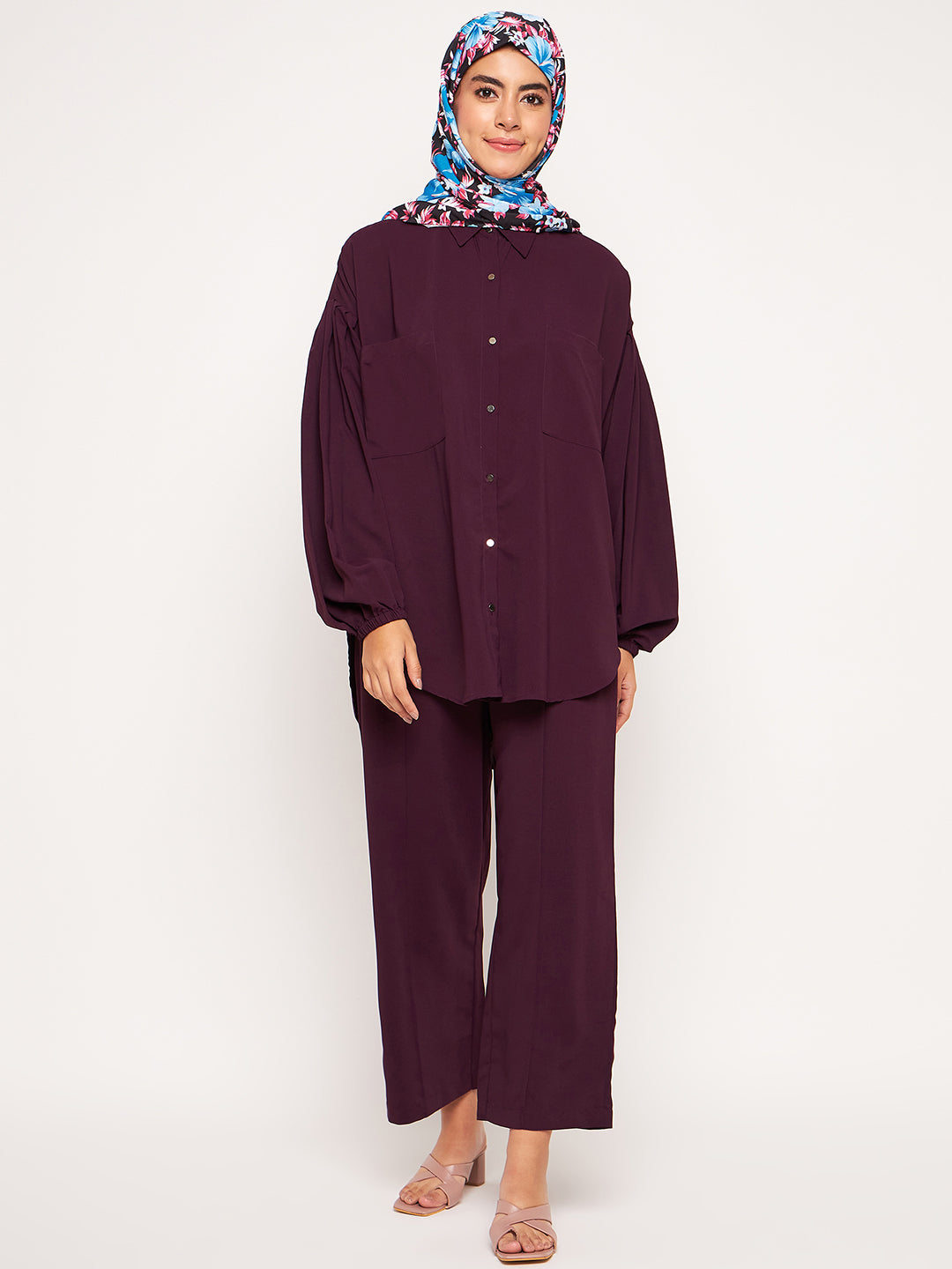 The Nabia Modest Matching Set combines a full-sleeved top with wide-leg pants, both made from premium purple solid cy crush fabric. This ensemble strikes the perfect balance between style and modesty, offering a comfortable and fashionable option. Ideal for those embracing modest fashion, it allows for a modestly elegant and stylish look