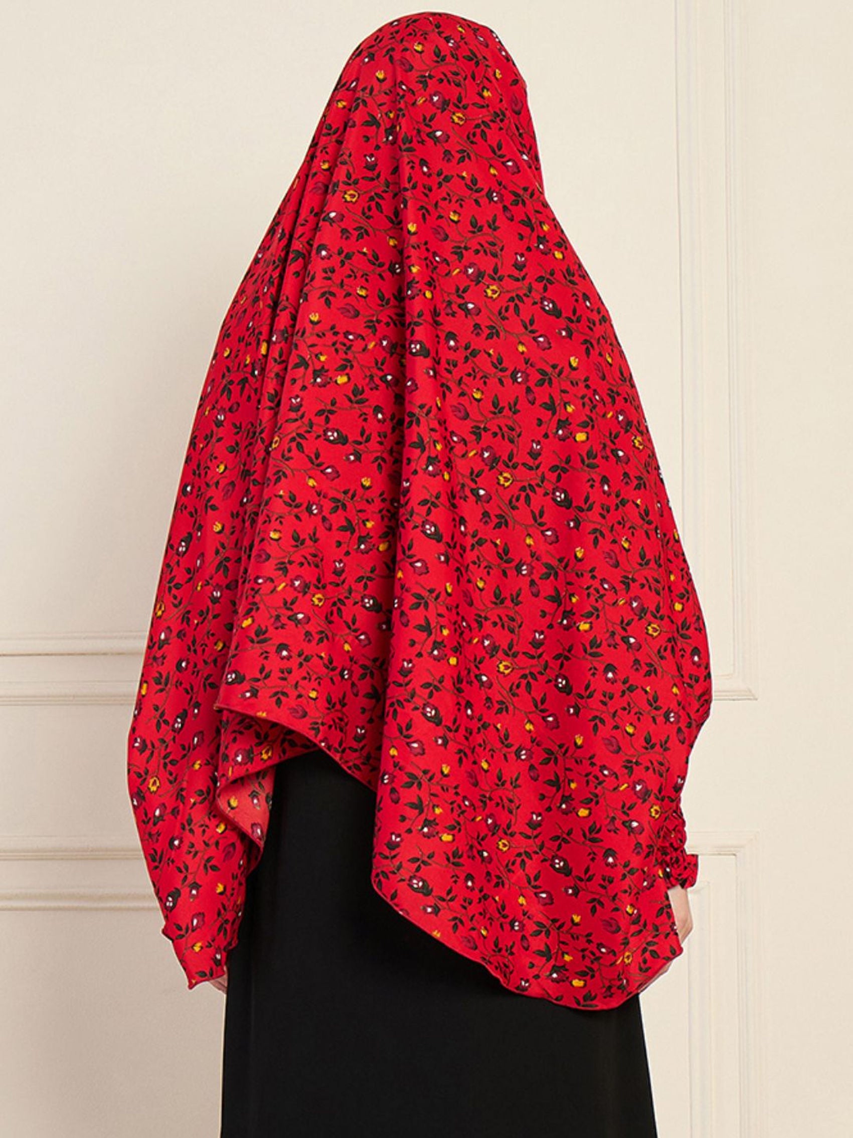 The Nabia red printed Khimar is a ready-to-wear hijab crafted for Islamic and Muslim women, combining style with convenience. Made from lightweight Crepe fabric, it features an integrated headband and ribbons for effortless adjustment, offering full head and chest coverage. Elasticated sleeves ensure a snug fit, adapting seamlessly to your face size. From the latest modest fashion collection, this Khimar is perfect for everyday wear, blending elegance, practicality, and comfort.
