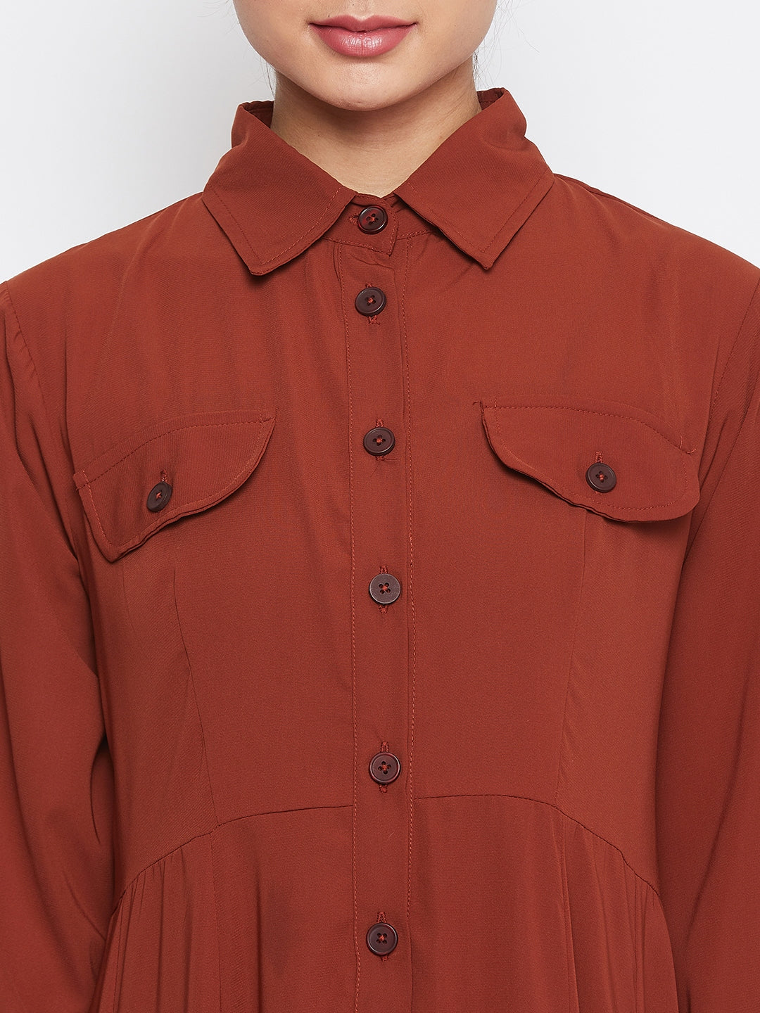 Nabia's Rust Abaya for women is a stylish choice in luxurious Nida Matte fabric. With a button closure on the neck, long and cuffed sleeves, and a shirt collar type, it exudes elegance and modernity. This abaya is perfect for contemporary Muslim women seeking a blend of fashion and modesty.