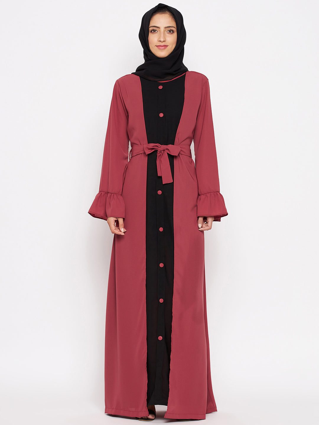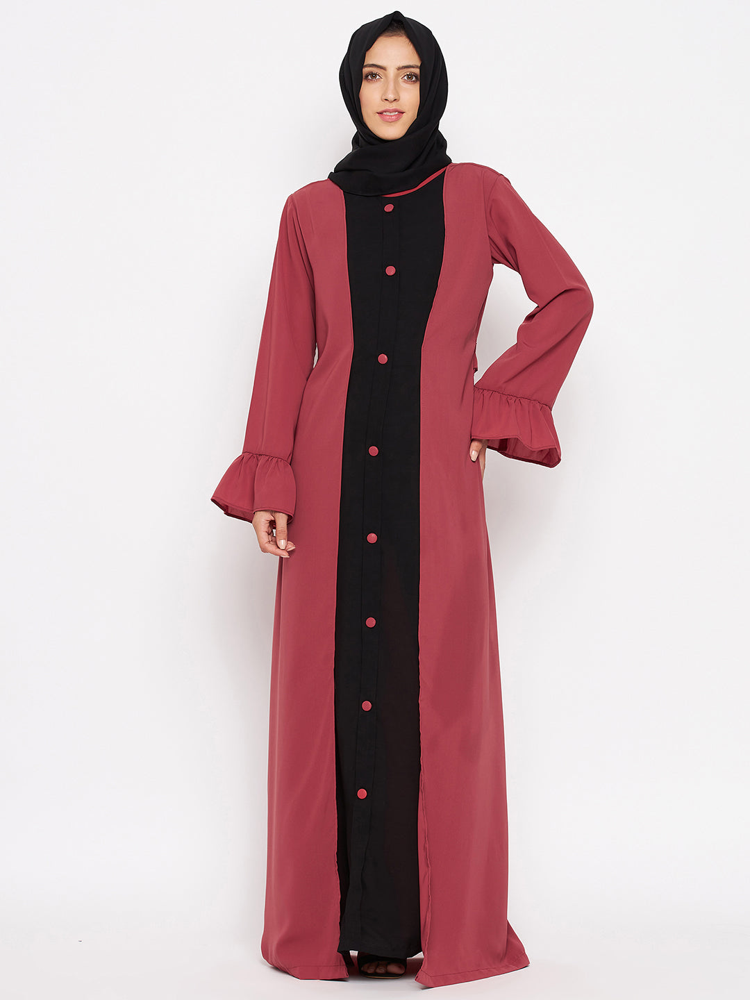 Nabia offers an exceptionally unique Abaya with two captivating color schemes. This features a beautiful combination of two distinct colours. . Made for your modesty and elegance while being a perfect comforting wear, it is adorned with two color combination, long bell sleeves, and round neck. The A-Line fit ensures supreme comfort and free movement while you are wearing it.