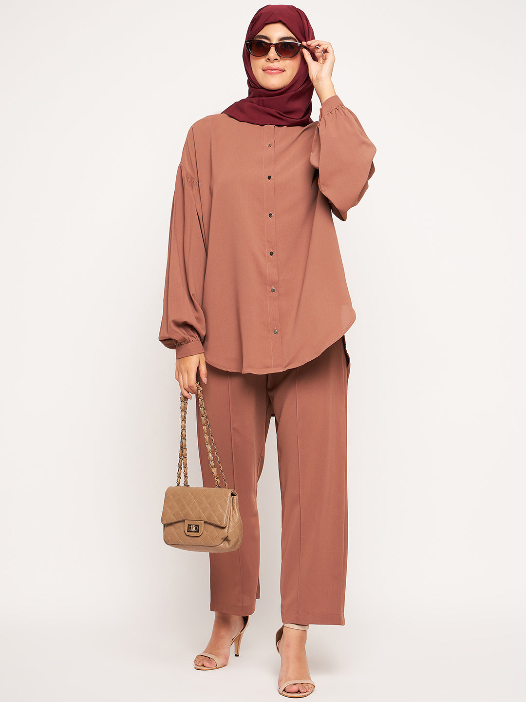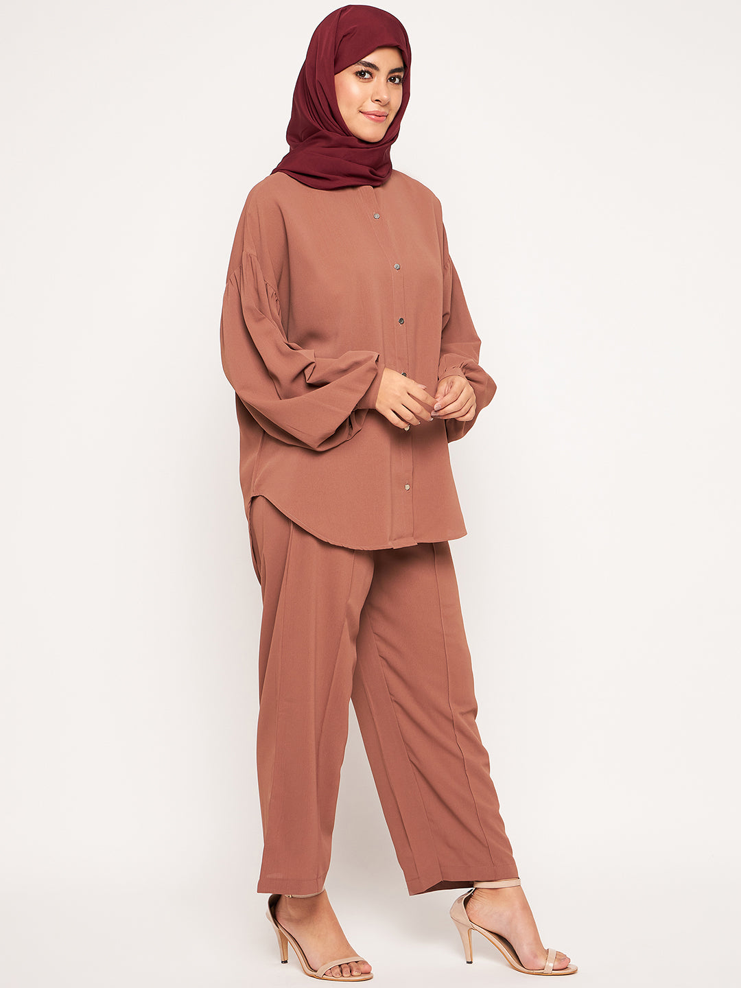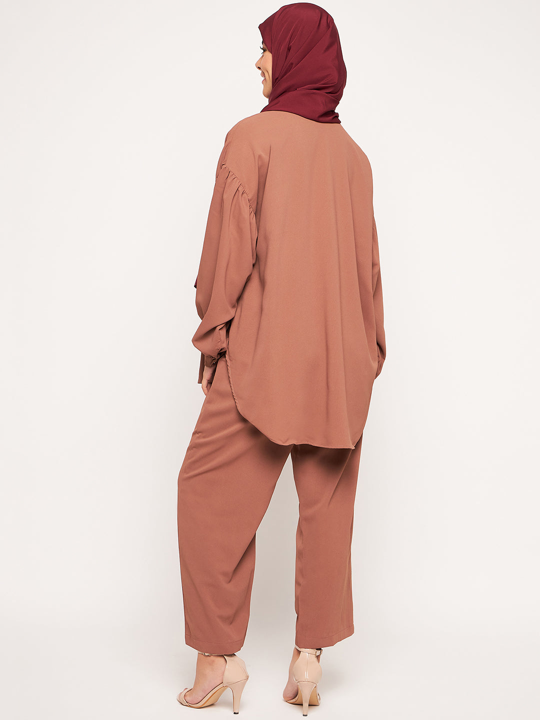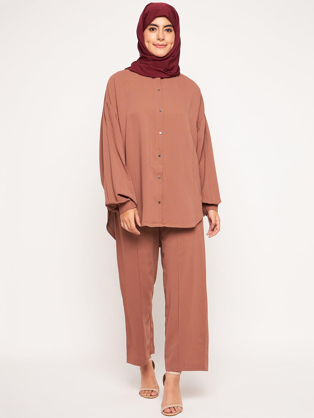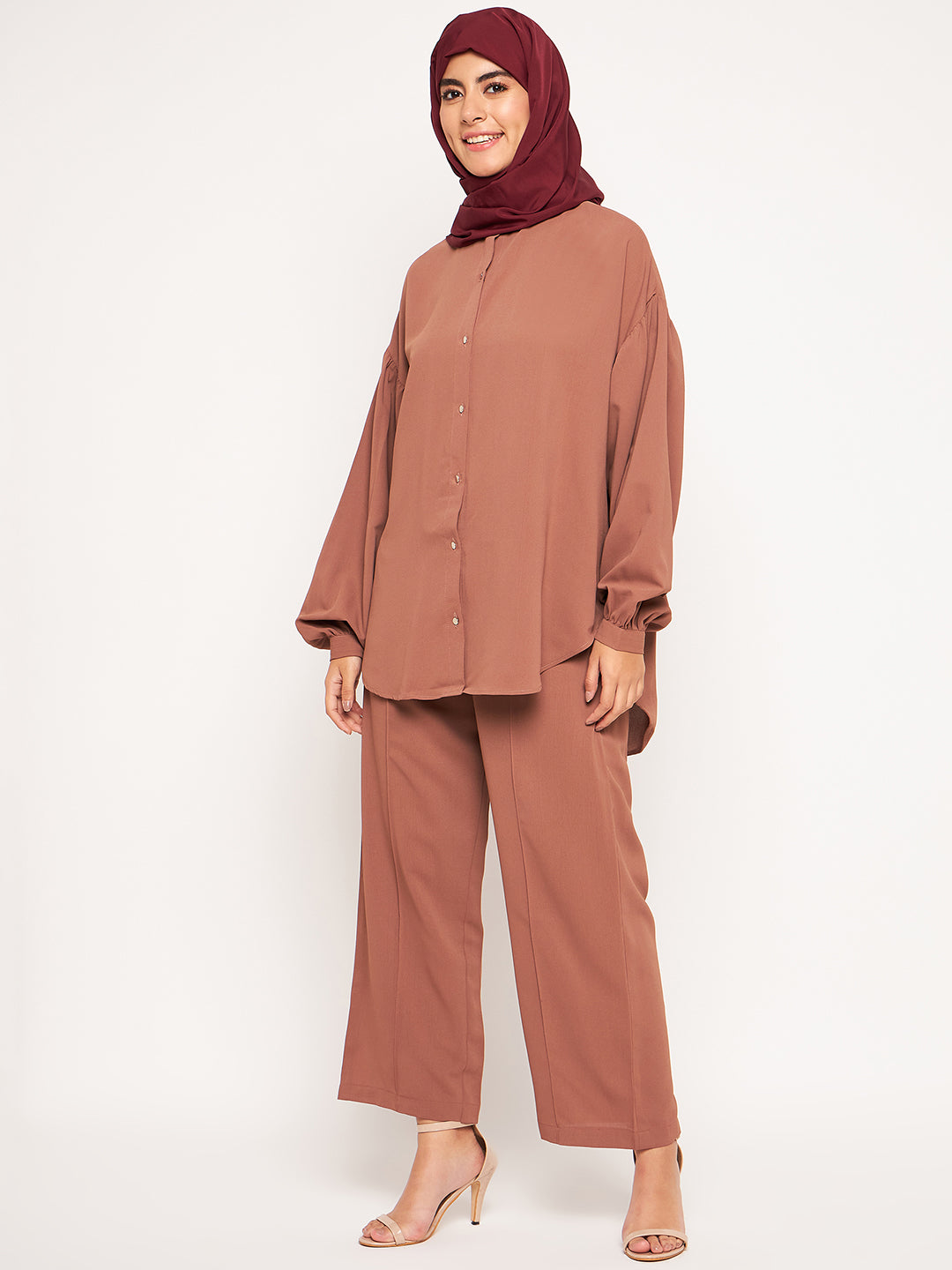 The Nabia Modest Matching Set combines a full-sleeved top with wide-leg pants, both made from premium maroon solid cy crush fabric. This ensemble strikes the perfect balance between style and modesty, offering a comfortable and fashionable option. Ideal for those embracing modest fashion, it allows for a modestly elegant and stylish look