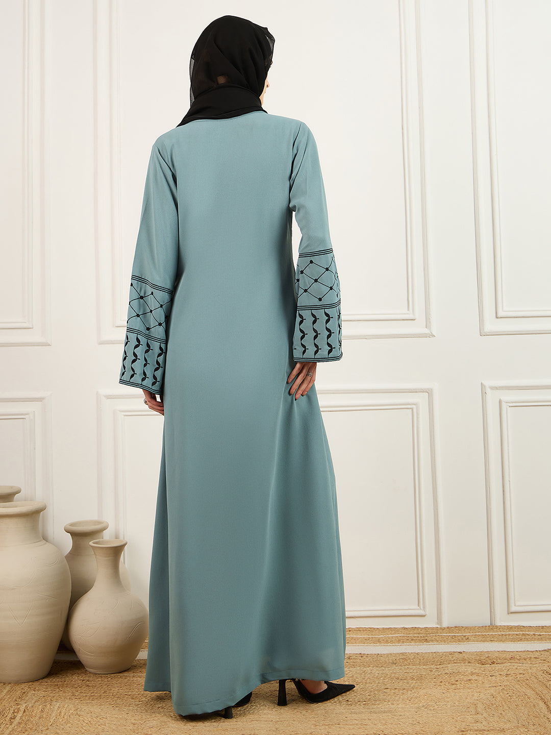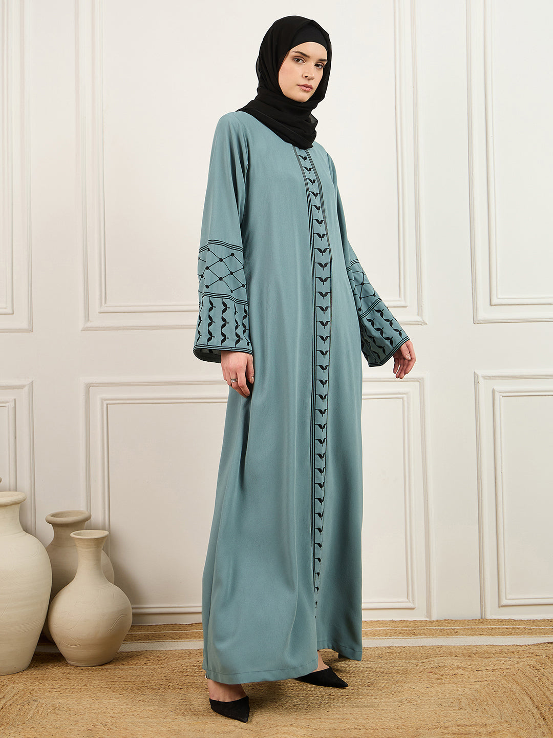 The sea green Palestine abaya epitomizes modest fashion and fusing comfort with cultural grace flawlessly. Crafted for Islamic women who value both style and tradition, it serves as a symbol of cultural pride and refined elegance. This meticulously designed garment transcends mere clothing, embodying a blend of tradition and contemporary sophistication.