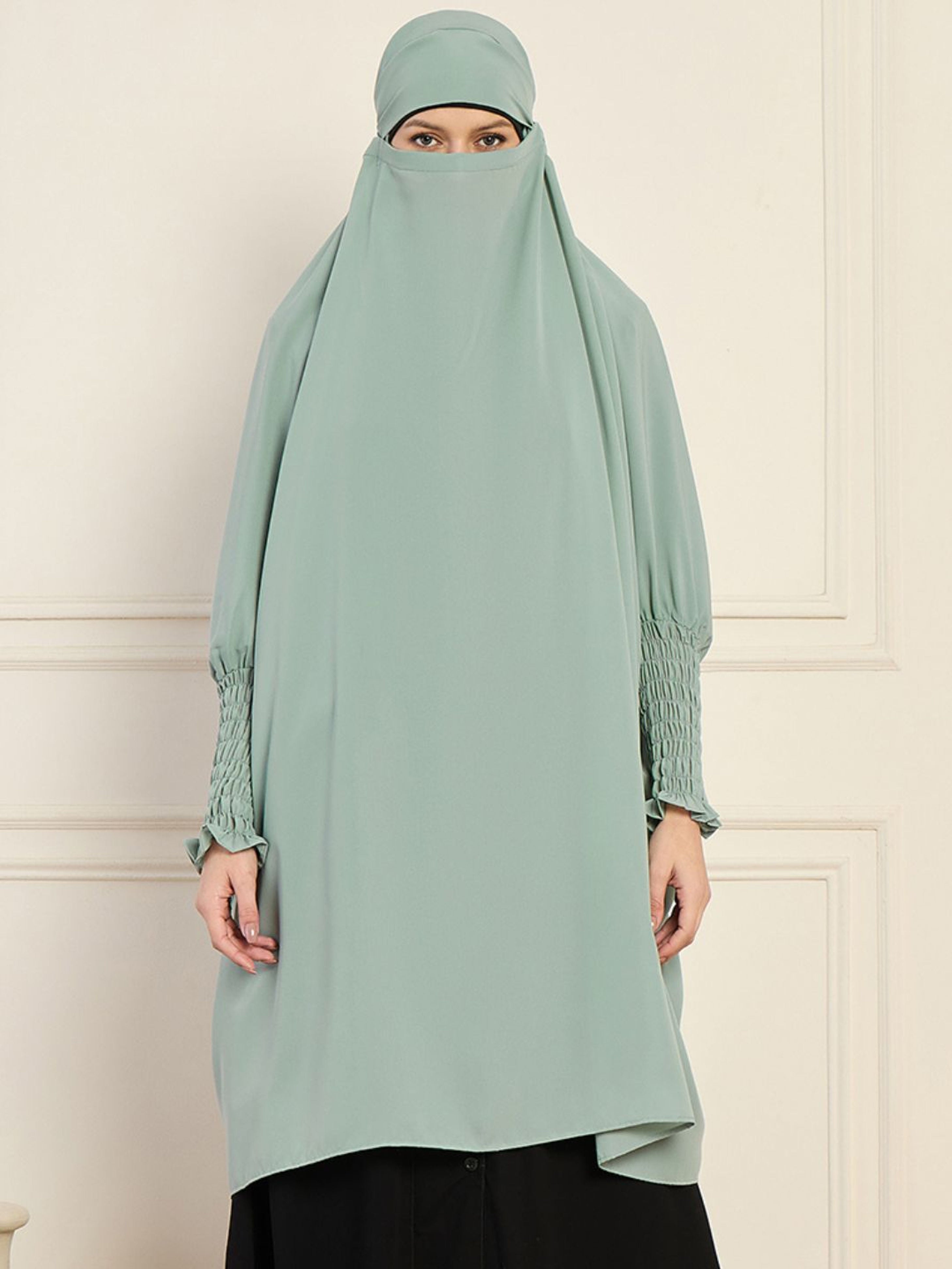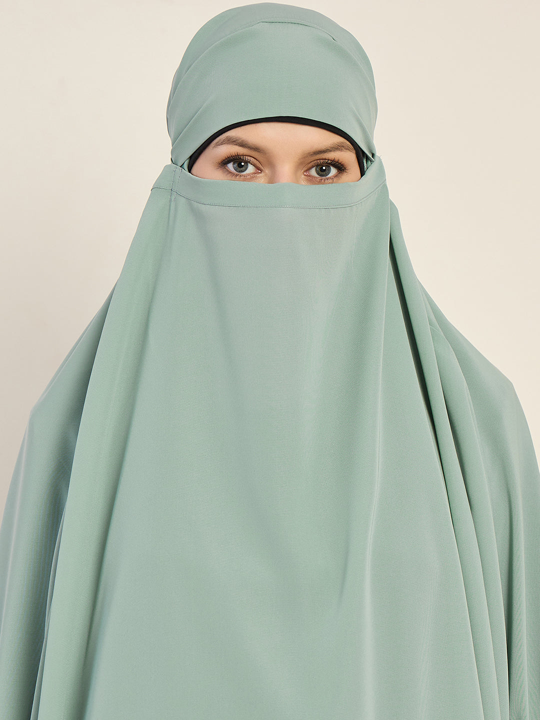 The Nabia sea green solid Khimar is a ready-to-wear hijab designed for Islamic and Muslim women, offering unmatched convenience and comfort. Crafted from premium Nida Matte fabric, it features an integrated headband and adjustable ribbons for seamless coverage of the head, mouth, and chest. Elasticated sleeves ensure a snug, personalized fit, adapting effortlessly to your face size. Part of the latest modest fashion collection, this versatile Khimar is perfect for everyday wear.