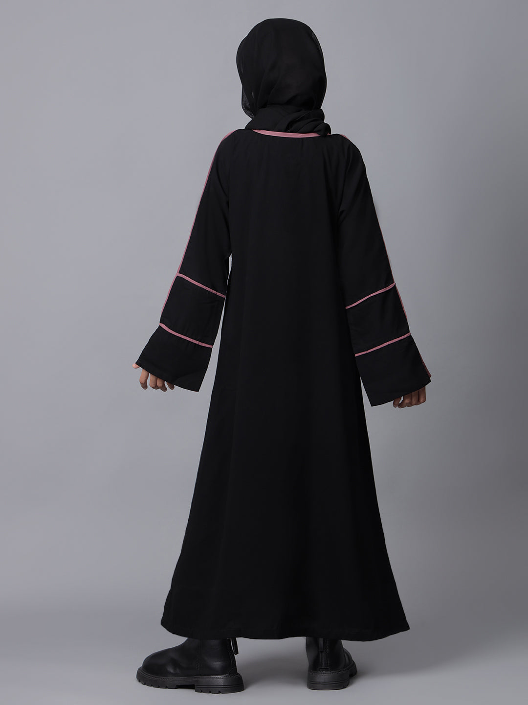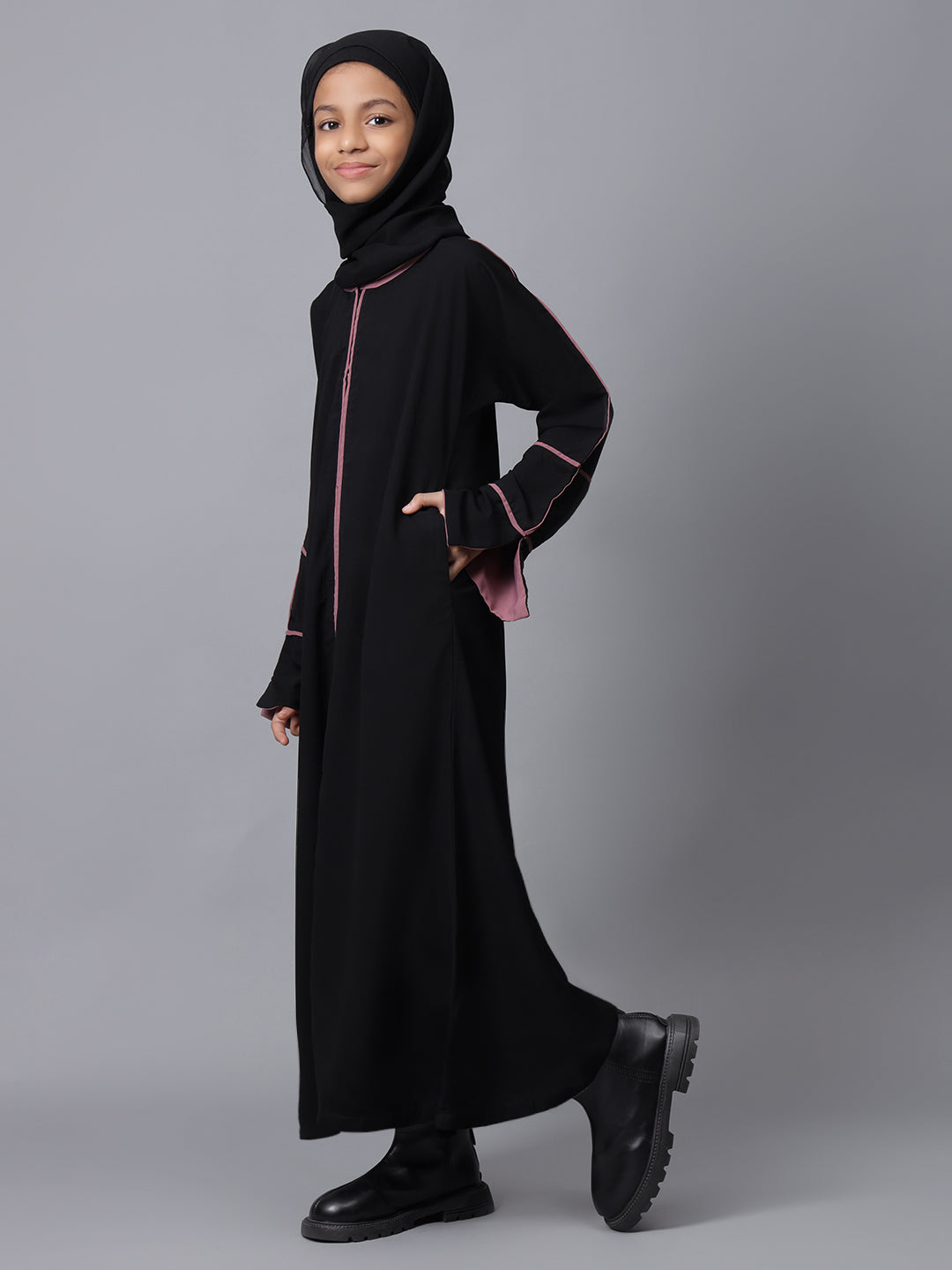 This black A-line solid Abaya for Muslim girls combines modesty with modern style. Featuring practical side pockets and sleek piping details, it reflects the latest fashion trends. The A-line design ensures a comfortable, flattering fit, making it perfect for everyday wear and special occasions while maintaining a stylish and modest appearance.