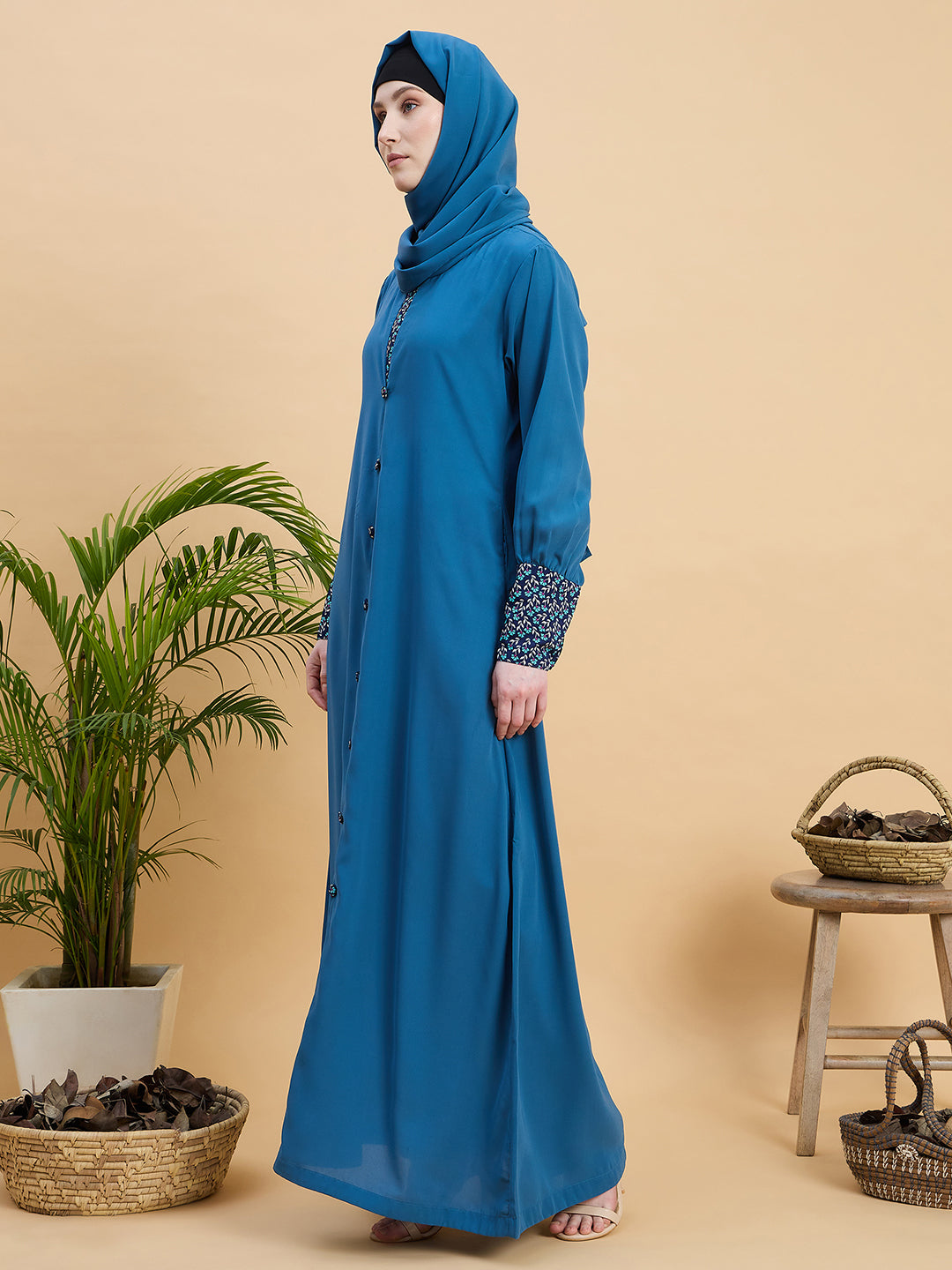 Revitalize your modest wardrobe with this sky blue abaya for women, tailored from high-quality Nida matte fabric that feels light, airy, and smooth with a graceful flow. Designed in a full-length silhouette with an easy slip-on style, long sleeves, and elegant printed cuffs, it provides modest coverage with refined comfort. Suitable for everyday wear, workplace use, salah, mosque visits, Ramadan gatherings, Eid celebrations, and religious occasions, this women’s sky blue abaya beautifully combines contemporary modest styling with classic elegance, offering durability, ease, and timeless appeal for modern women.