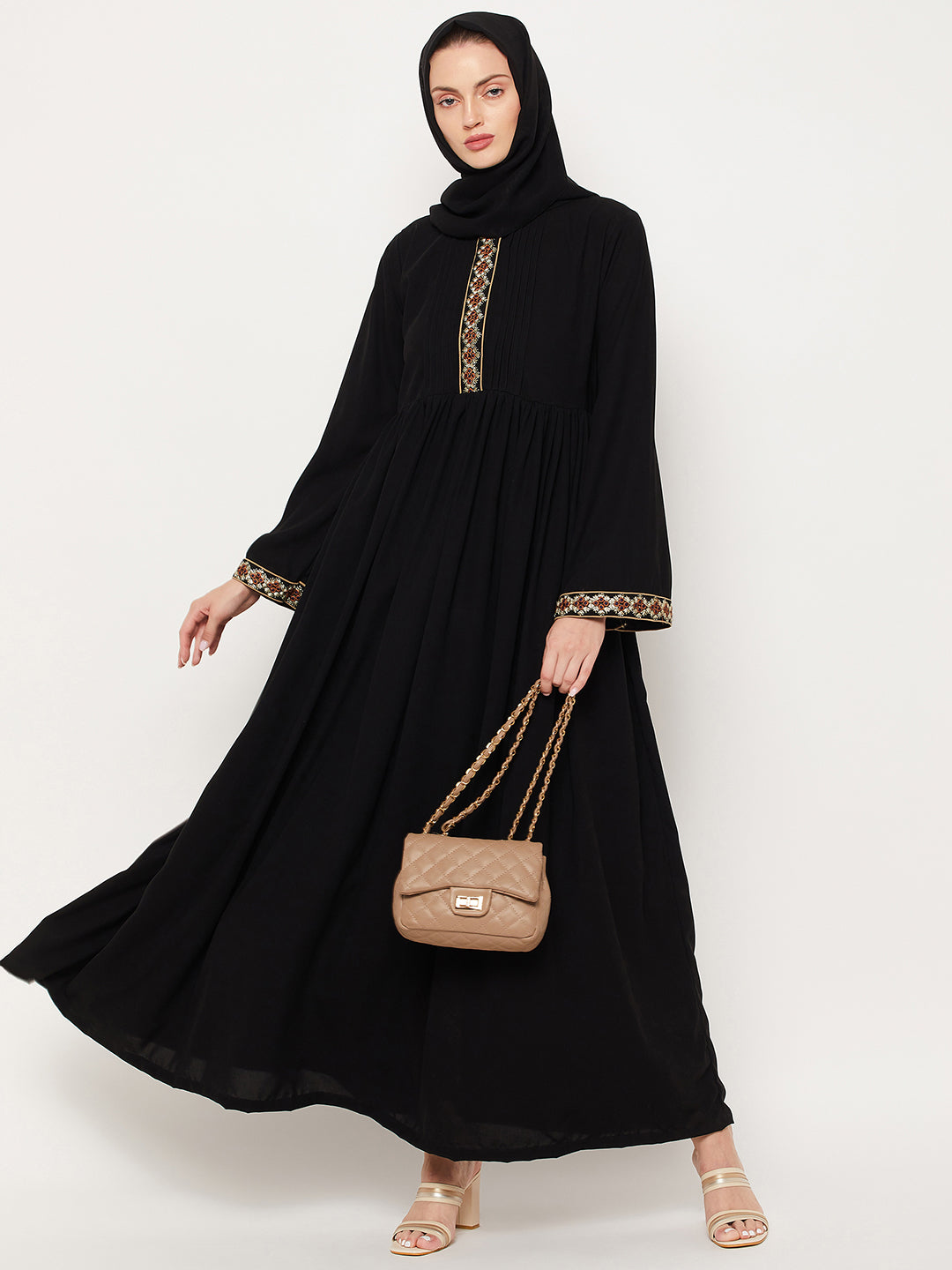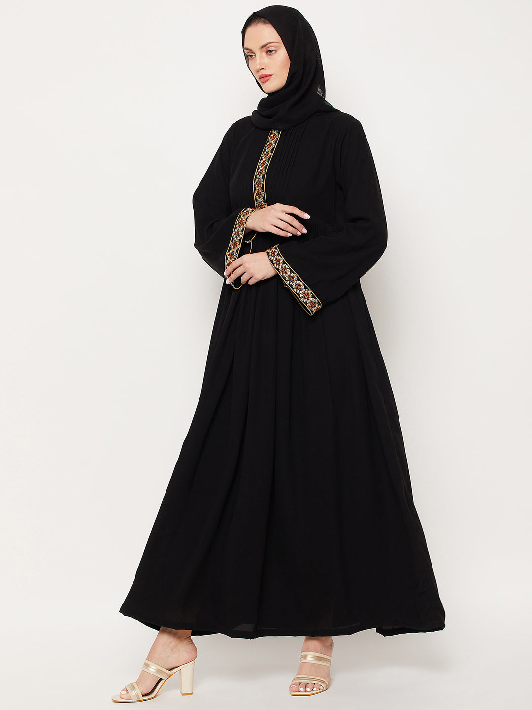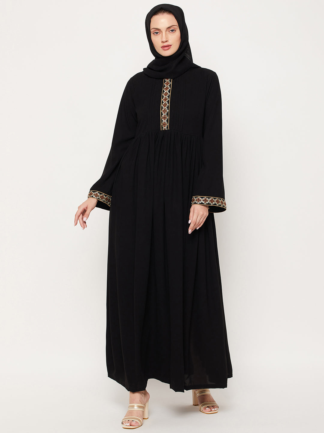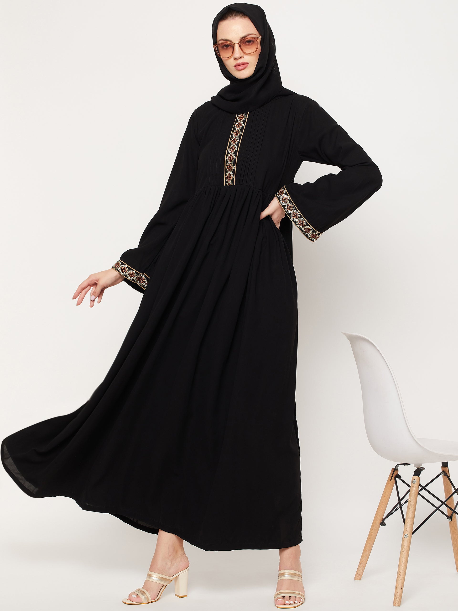 Nabia's Black Embroidery Abaya offers a stylish choice for modest Muslim women. Crafted from high-quality Nida Matte Fabric, this Abaya features intricate embroidery on the neck and sleeves, combining Islamic values with contemporary fashion. Available online, it allows women to express their faith gracefully while staying true to their modest cultural values, making it a perfect option for various occasions.