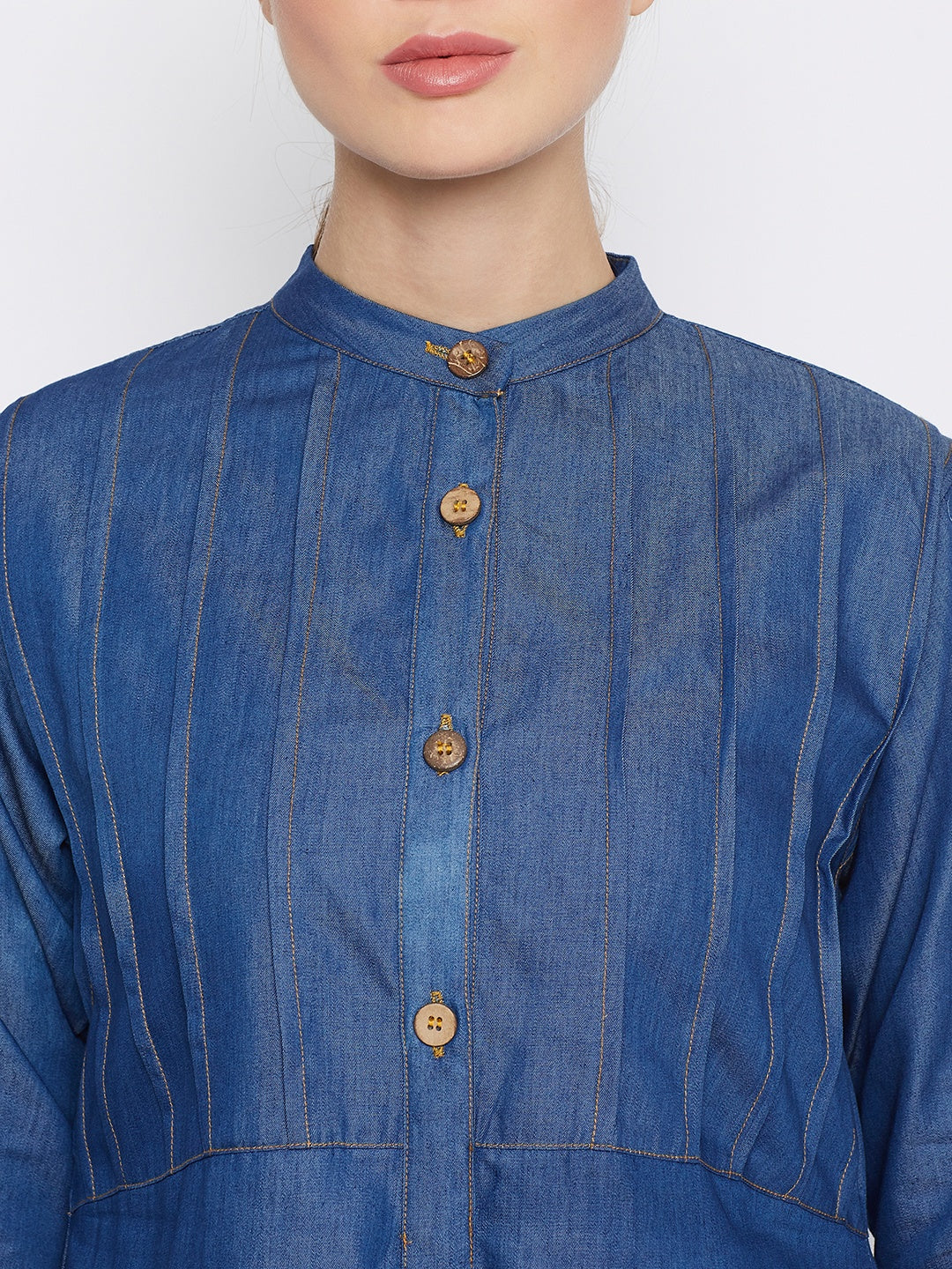 Nabia's Abaya for women is crafted from solid denim cotton fabric, showcasing a plate design on the front. The long sleeves, Mandarin collar, and modest yet elegant design make it an ideal choice for modern Muslim women seeking both fashion and comfort.