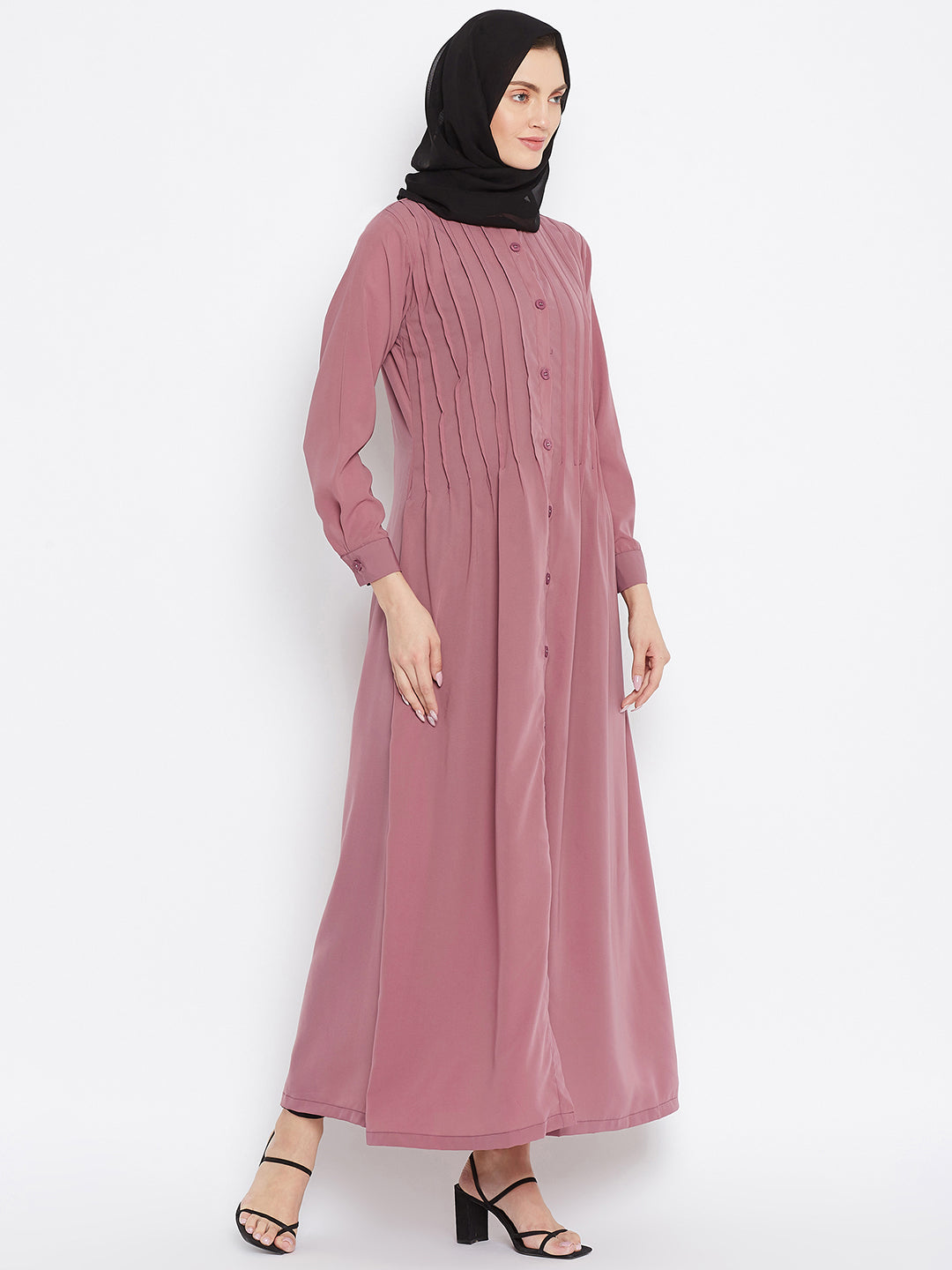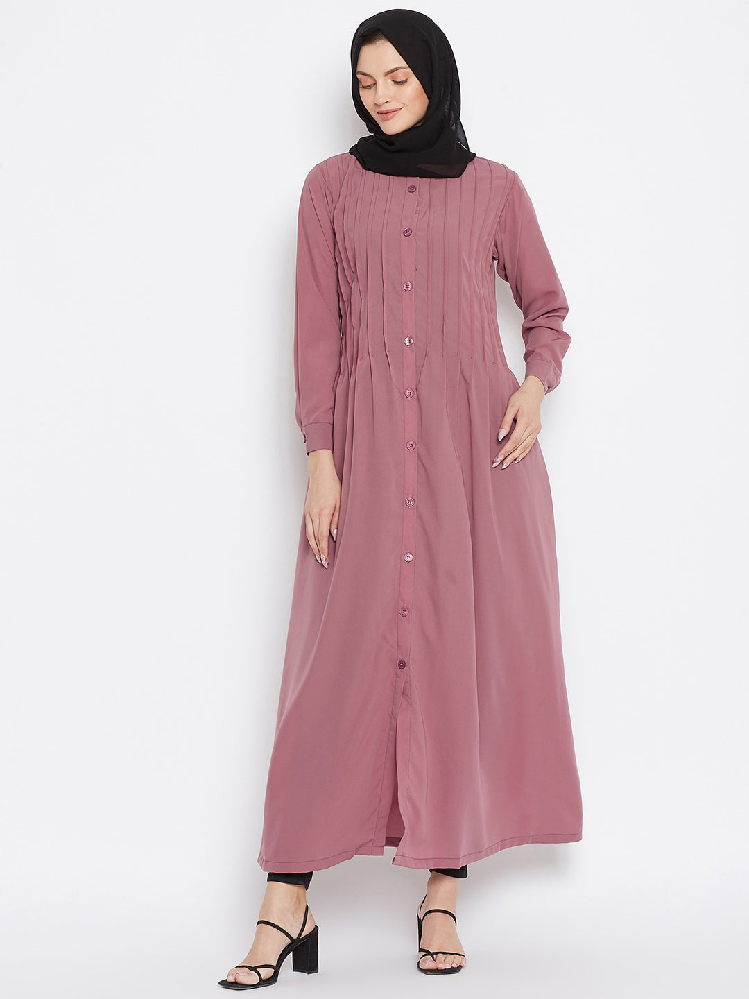 Nabia's Abaya for women is tailored from solid Nida Matte fabric, presenting a front-open design with a plate design on the front. Long & cuffed sleeves and a mandarin collar add an elegant touch, offering a perfect combination of modesty and contemporary style for modern Muslim women.