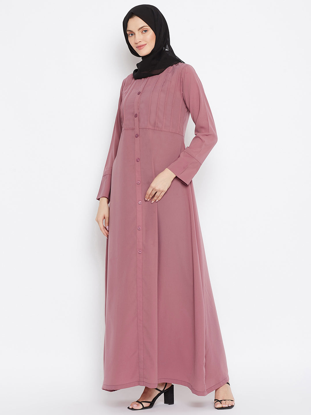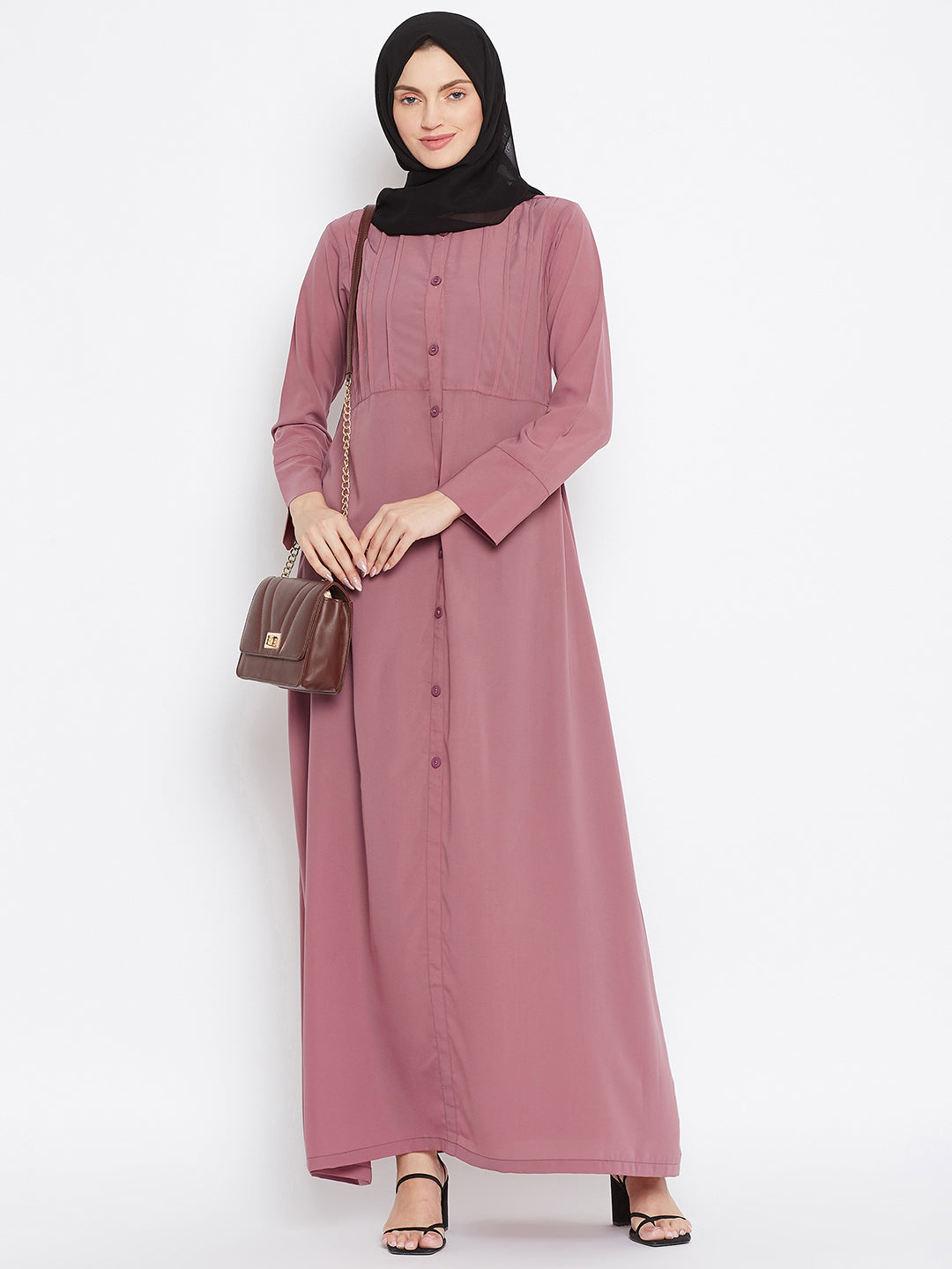 Nabia's Abaya for women is crafted from solid Nida Matte fabric, showcasing a plate design on the front. The long sleeves, Mandarin collar, and modest yet elegant design make it an ideal choice for modern Muslim women seeking both fashion and comfort.