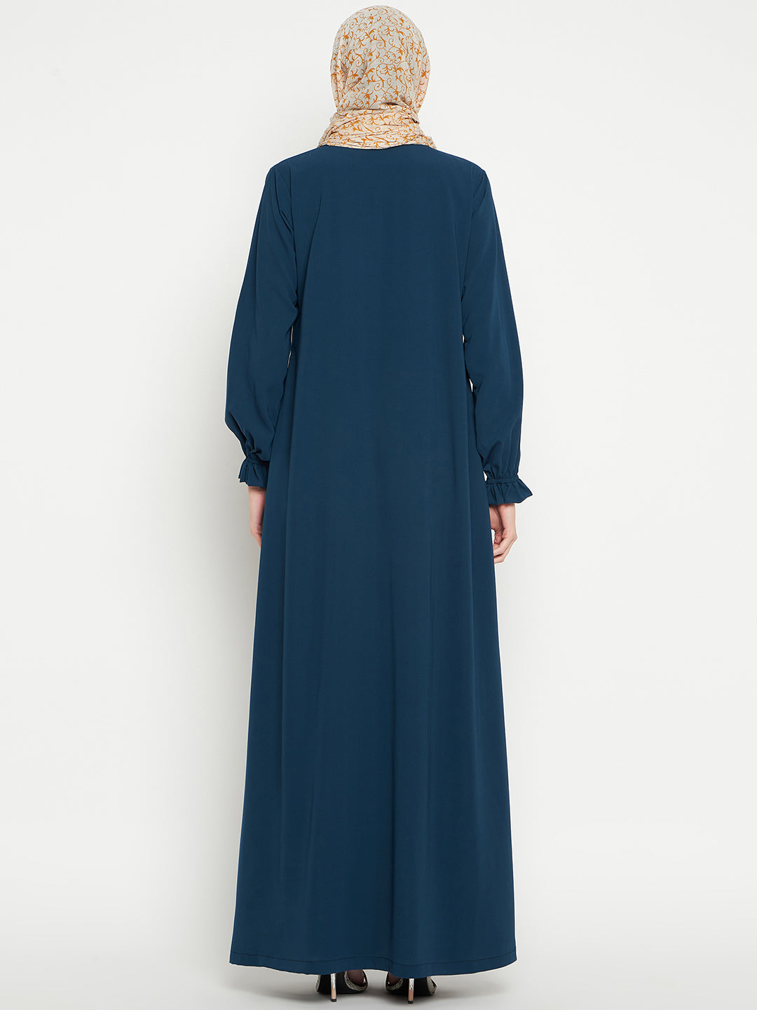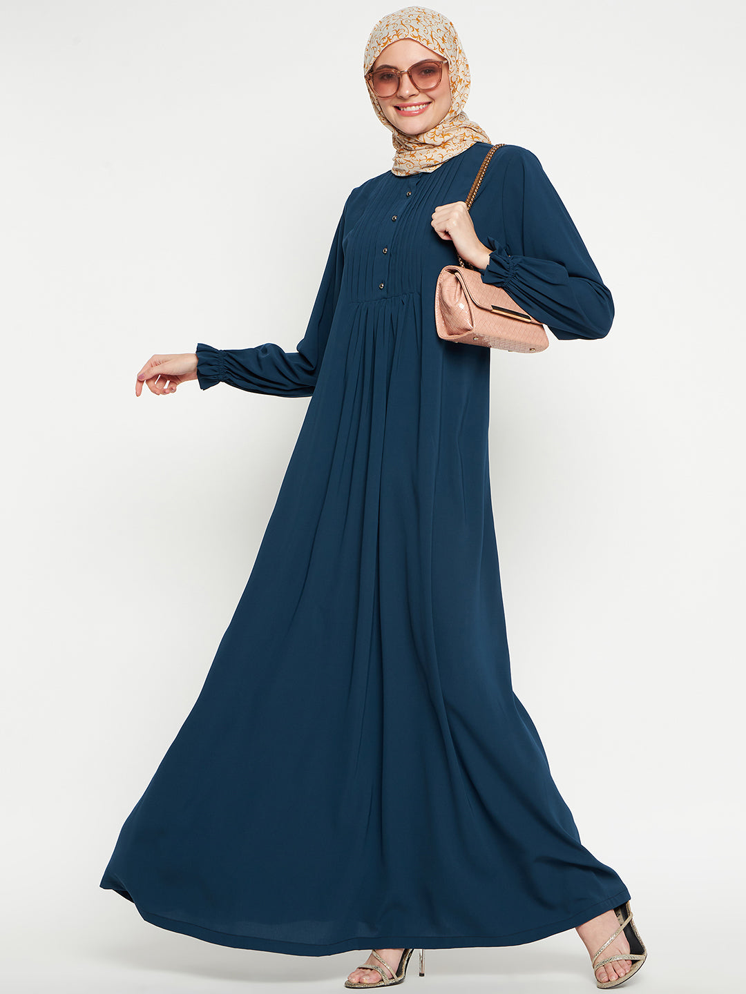 The Nabia A-Line Teal abaya for women showcases elegant pleats and buttons on the front, adding a stylish design element. With elastic in the sleeves for adjustment and crafted from Nida Matte fabric, it offers both fashion and comfort.