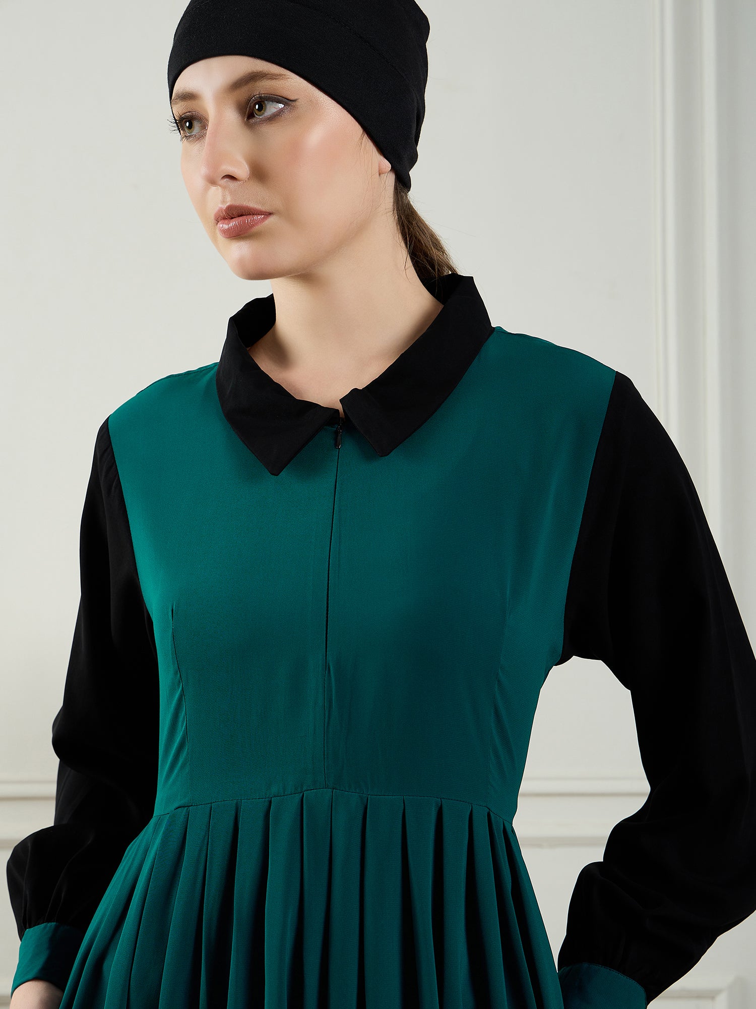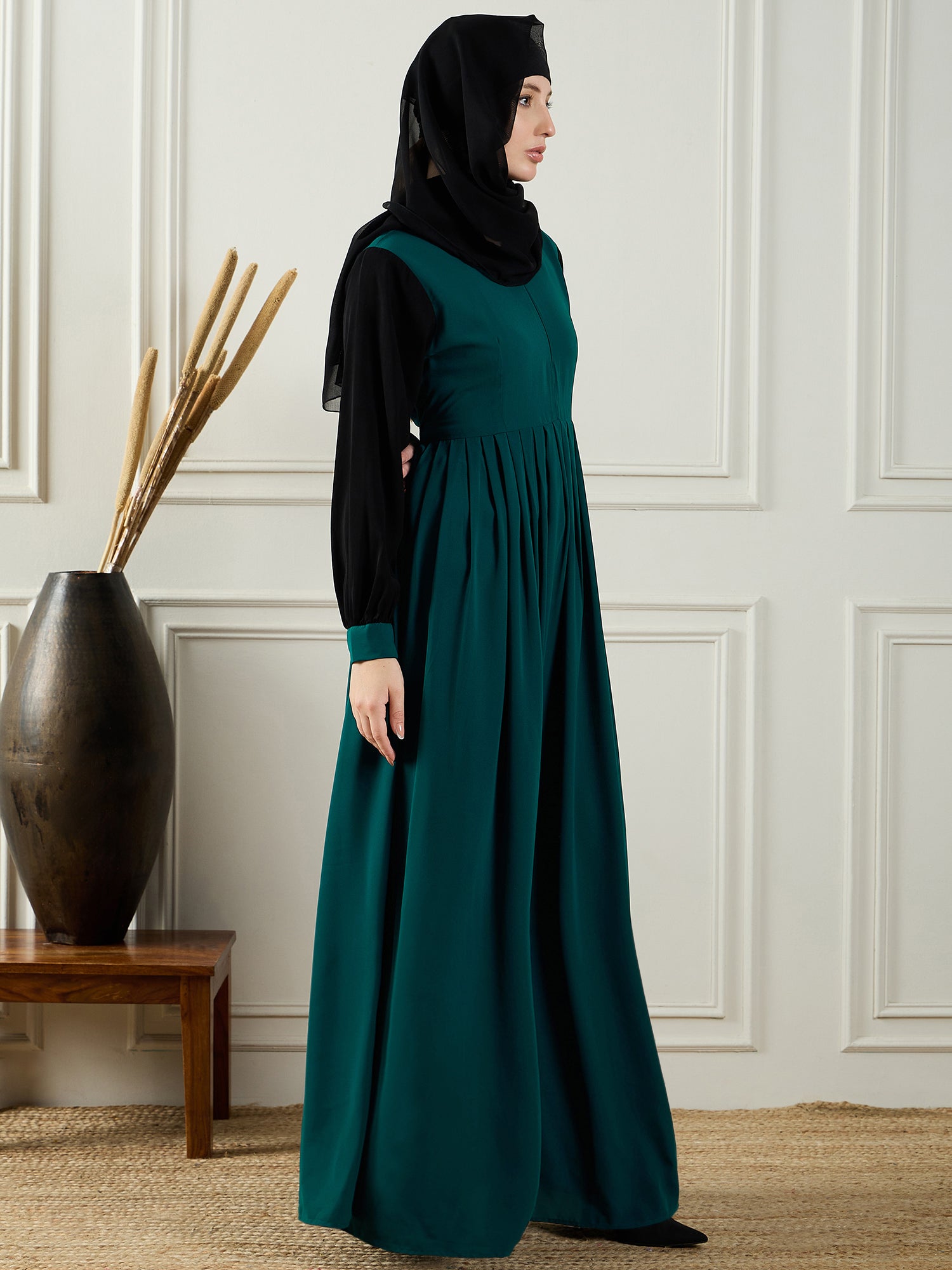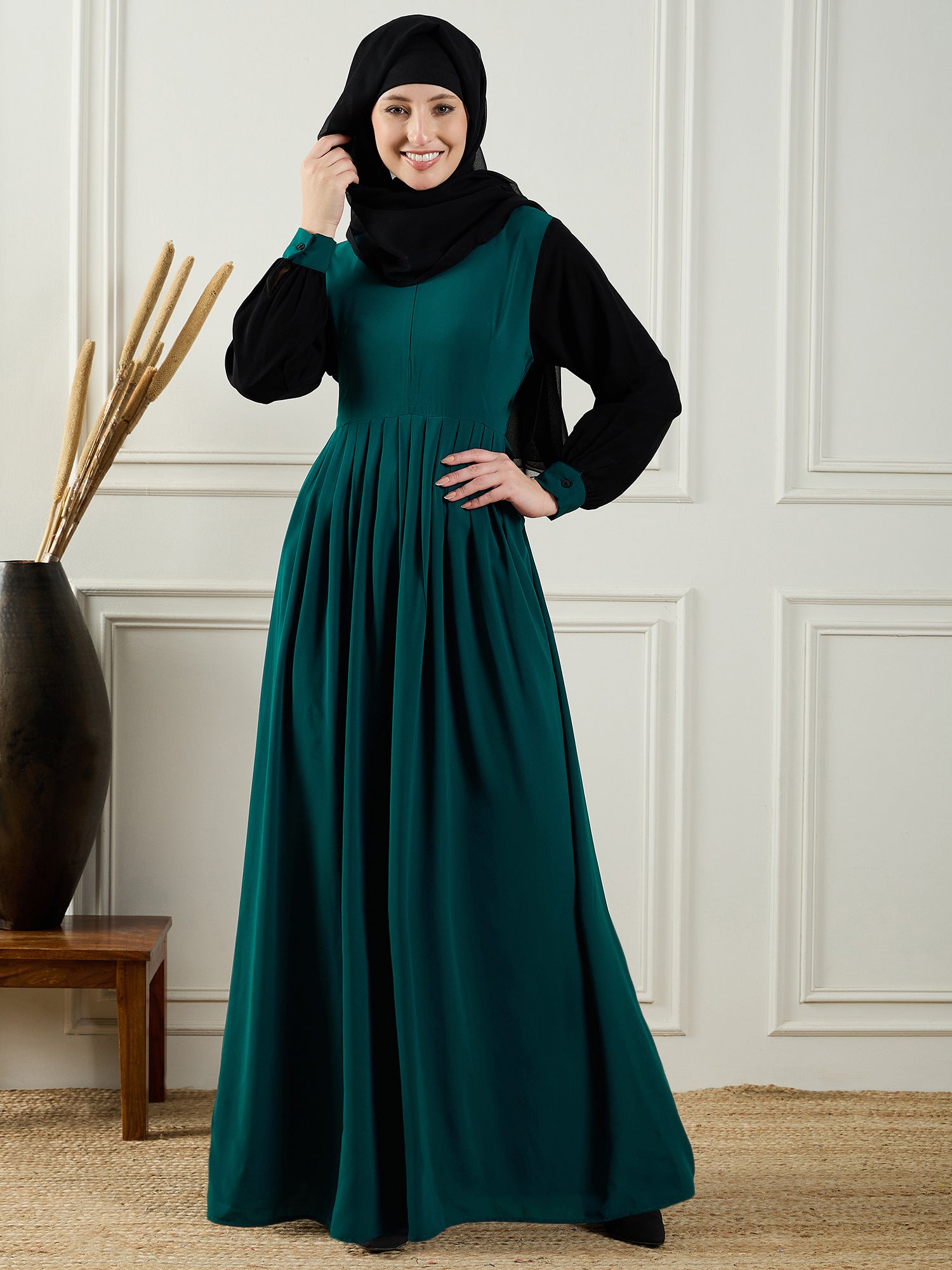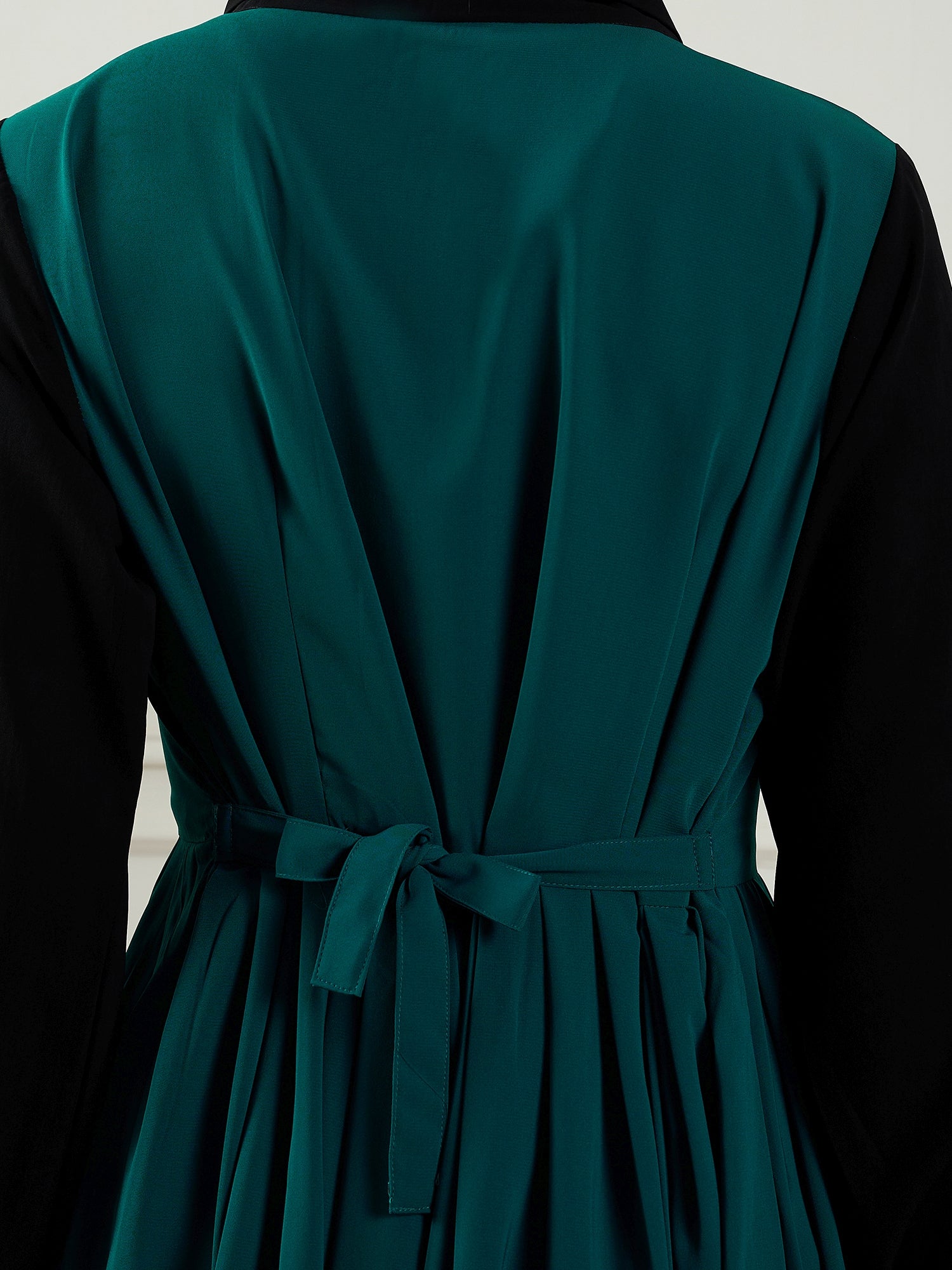 This two-color bottle green and black abaya burqa offers a blend of modesty and style for Islamic and Muslim women. The latest trending design features a relaxed fit with solid colors, attached belt, perfect for daily wear. Its elegant contrast brings a modern touch to traditional fashion, making it a versatile choice for modest, fashionable women.