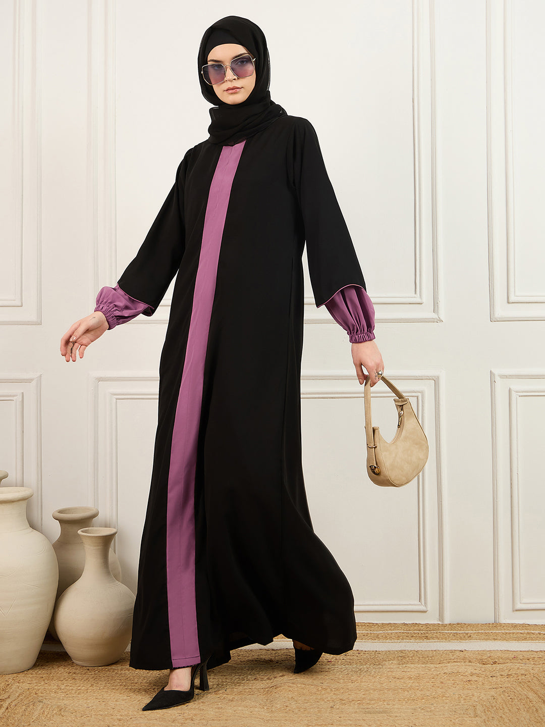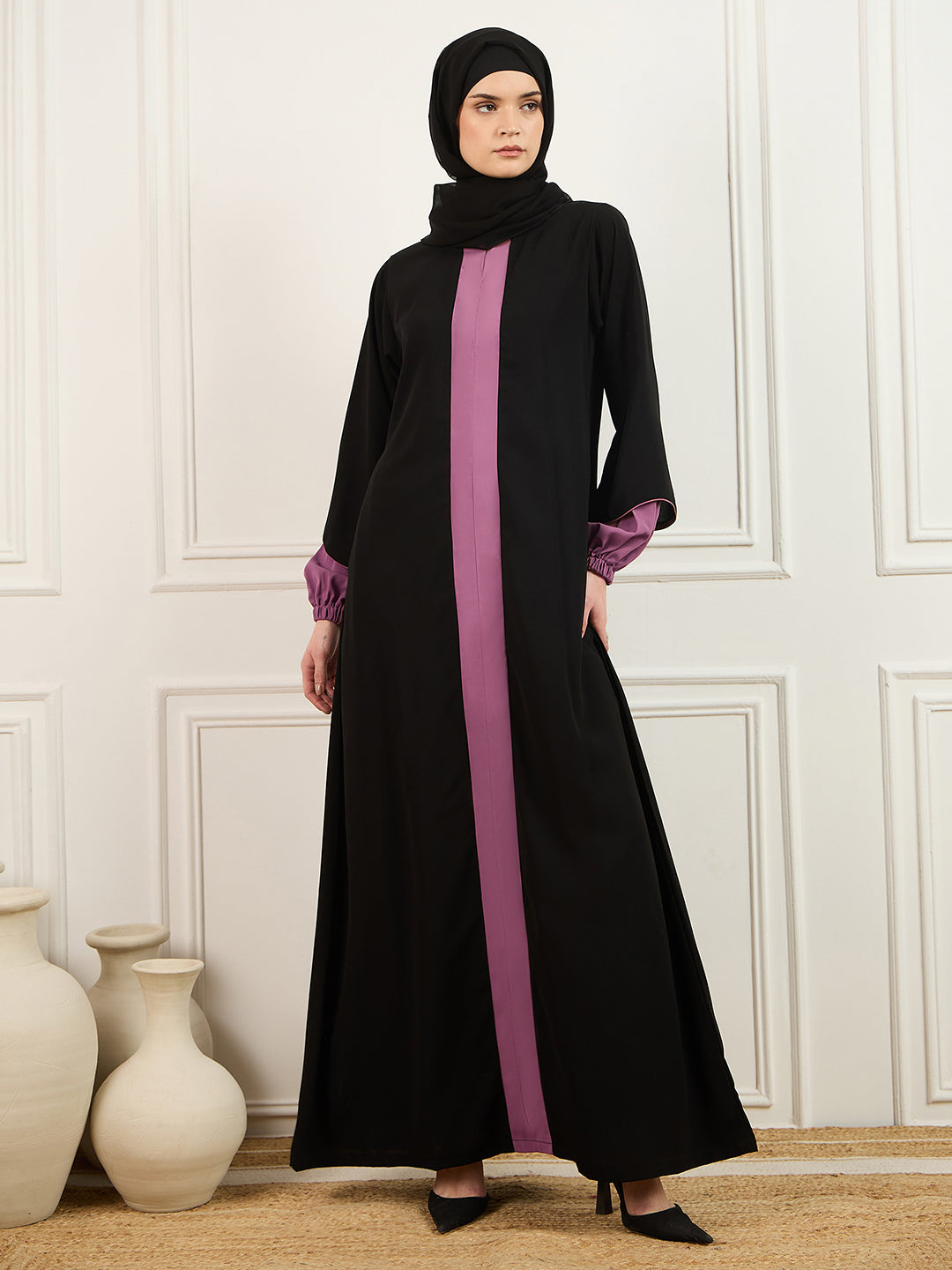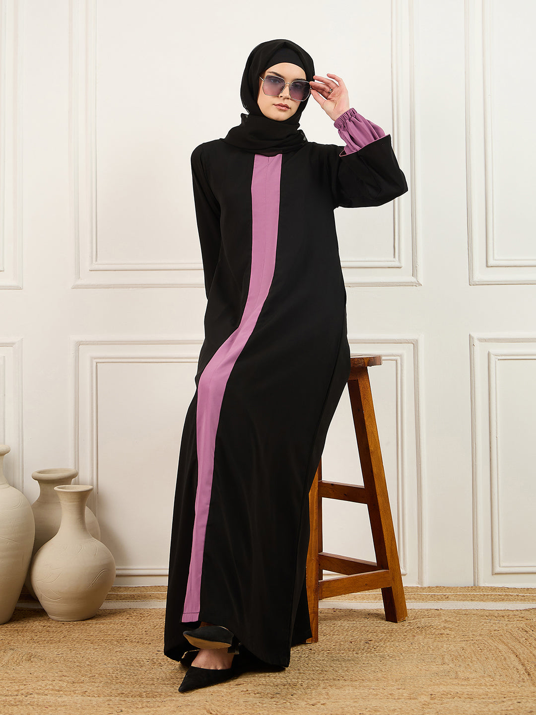 Step into modest fashion with this elegant two-colored black and pink abaya burqa. Crafted from premium Nida matte fabric, it features a round neckline, long elastic sleeves, a slip-on design, and a front neck button for easy wear. The solid color-block combination adds a stylish edge to its modest appeal. Perfect for any occasion, this abaya is ideal for Muslim women who value comfort, sophistication, and timeless Islamic style.