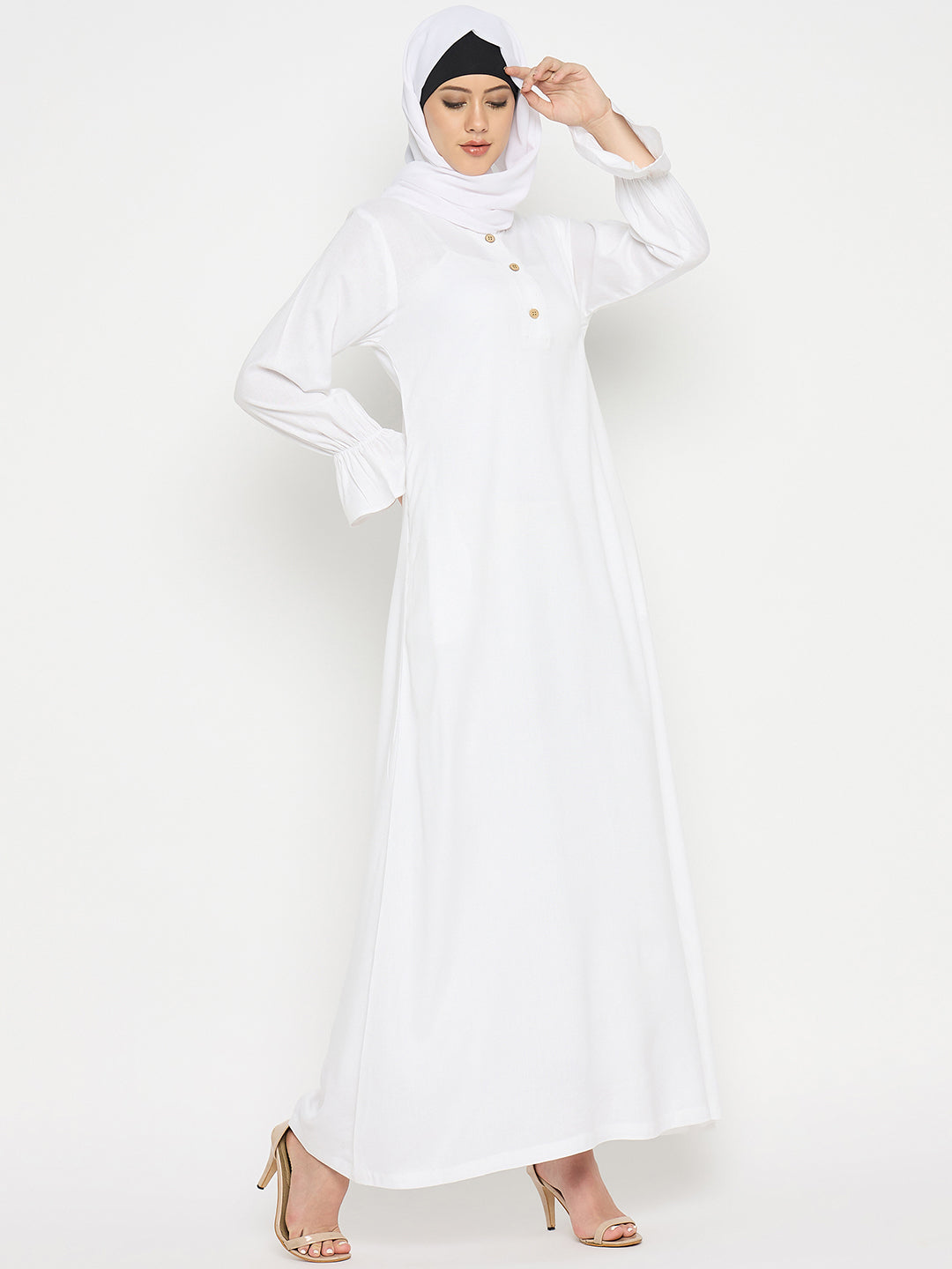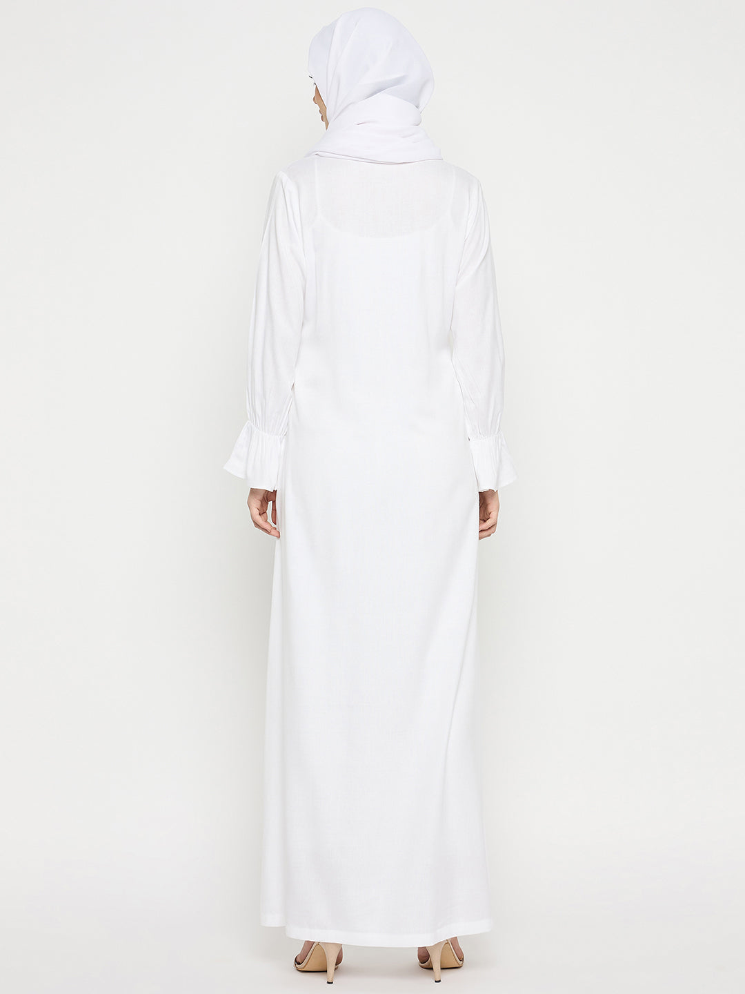 Nabia's White Rayon Abaya for women embodies grace and practicality, perfect for Umrah or Hajj. With its three front button closure and two side pockets, it merges elegance with functionality. Tailored for modern Muslim women, it offers both modesty and convenience. This abaya presents a seamless blend of style and utility, ensuring a chic and comfortable experience during religious pilgrimages.