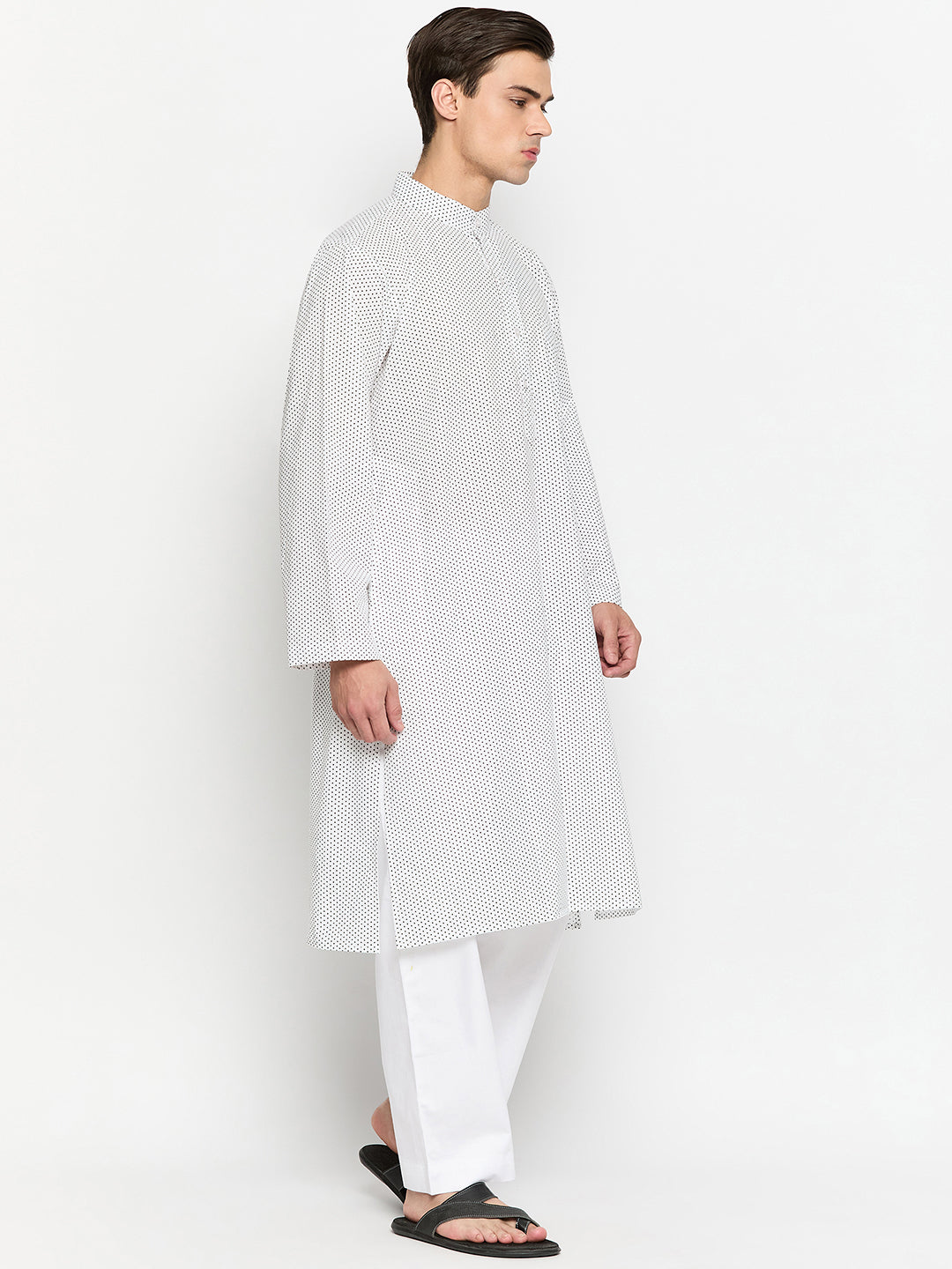 This men's white solid kurta features a subtle polka dot pattern, long sleeves, and a mandarin collar. Designed with a loose fit and side pockets for convenience, it combines contemporary style with comfort. Made from soft cotton fabric, this kurta is perfect for regular use, offering durability and a fashionable look for modern men.