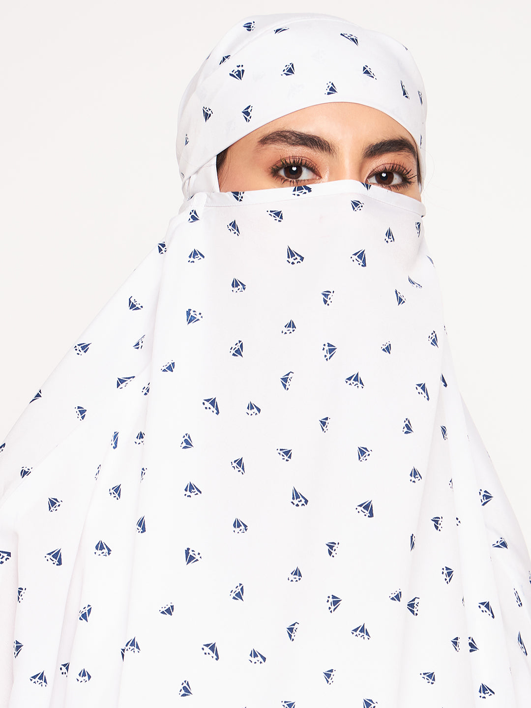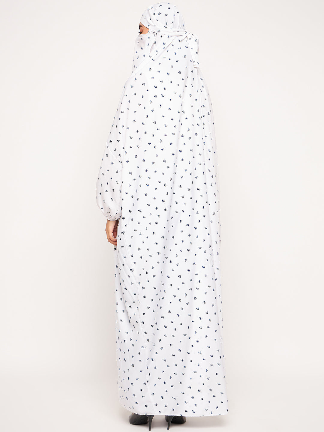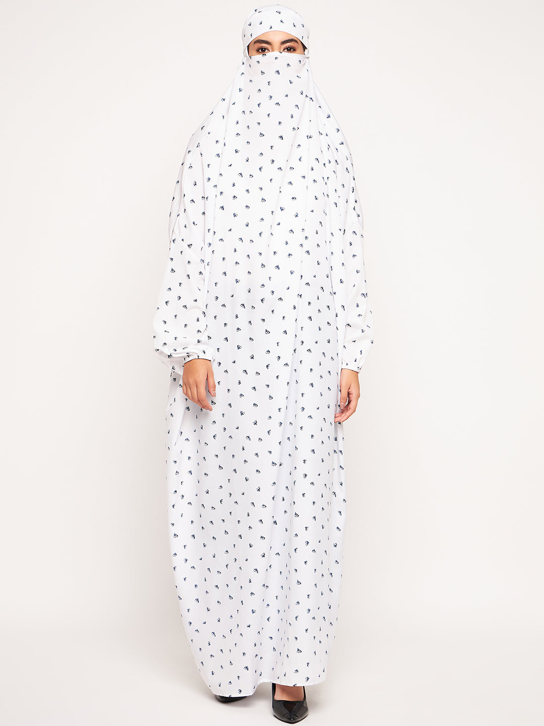 The Nabia Jilbab Abaya is a modest Islamic attire that offers full-length coverage with full sleeves. Crafted from high-quality polyester fabric , it blends modesty with style. Ideal for Muslim women seeking elegant modest wear, this white printed Abaya provides both comfort and a fashionable look, allowing for a modestly chic appearance in line with Islamic traditions.