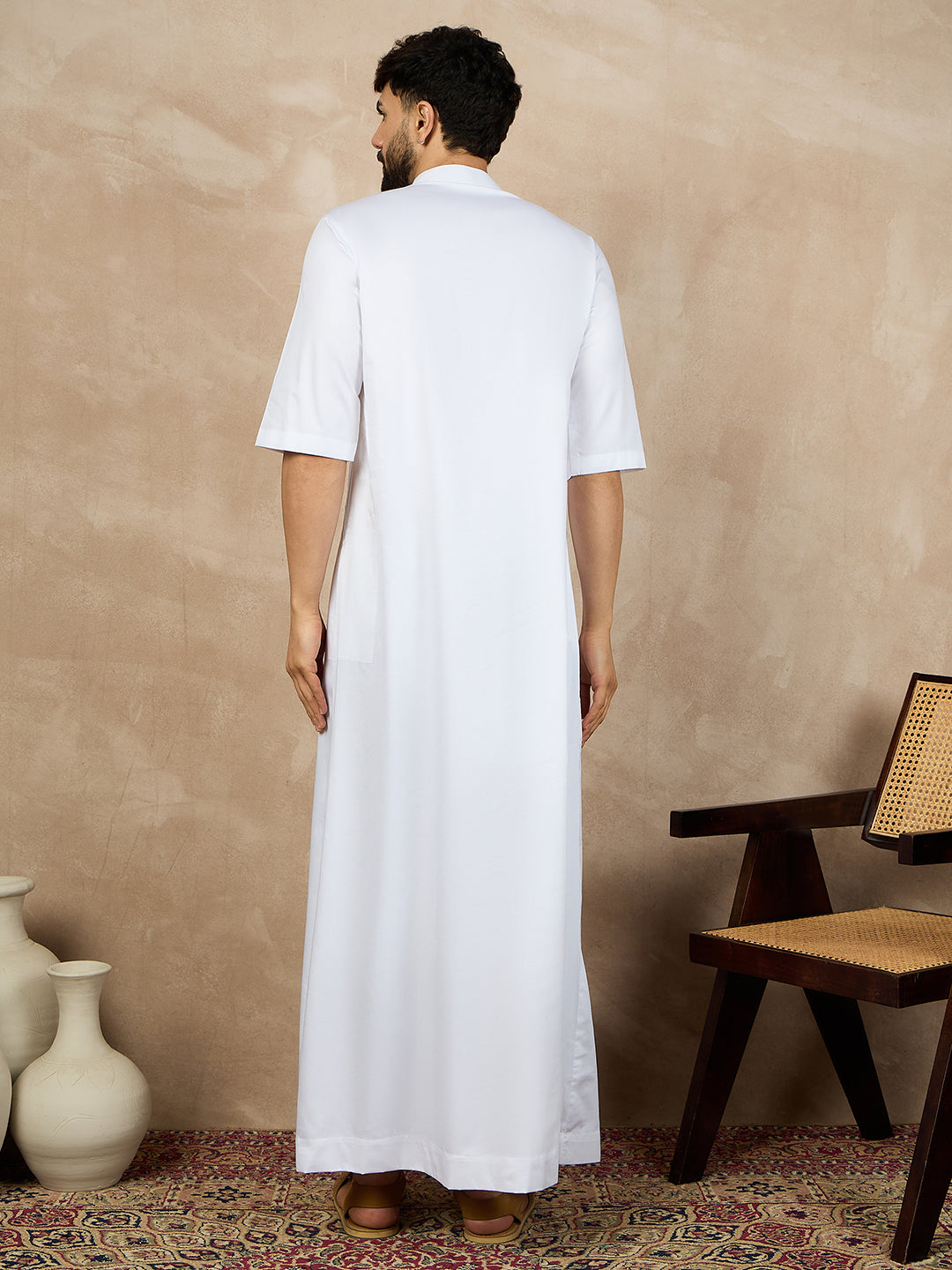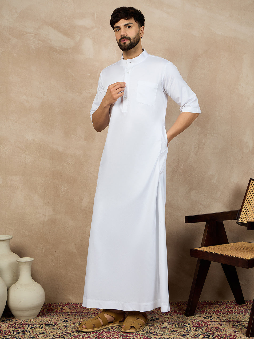 The Nabia white cotton Arabic Saudi thobe/jubba is crafted for Muslim men who appreciate comfort and style. Made from soft, breathable cotton, it features half sleeves and functional pockets for practicality. Designed with a relaxed fit, this elegant thobe blends traditional charm with modern sophistication, making it perfect for any occasion. Elevate your look effortlessly with this timeless and versatile ensemble.