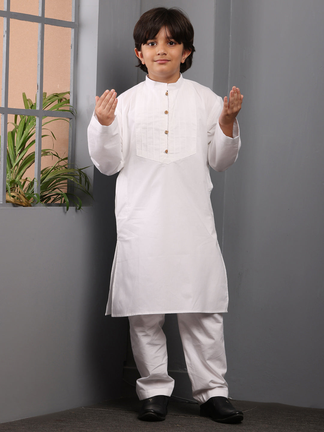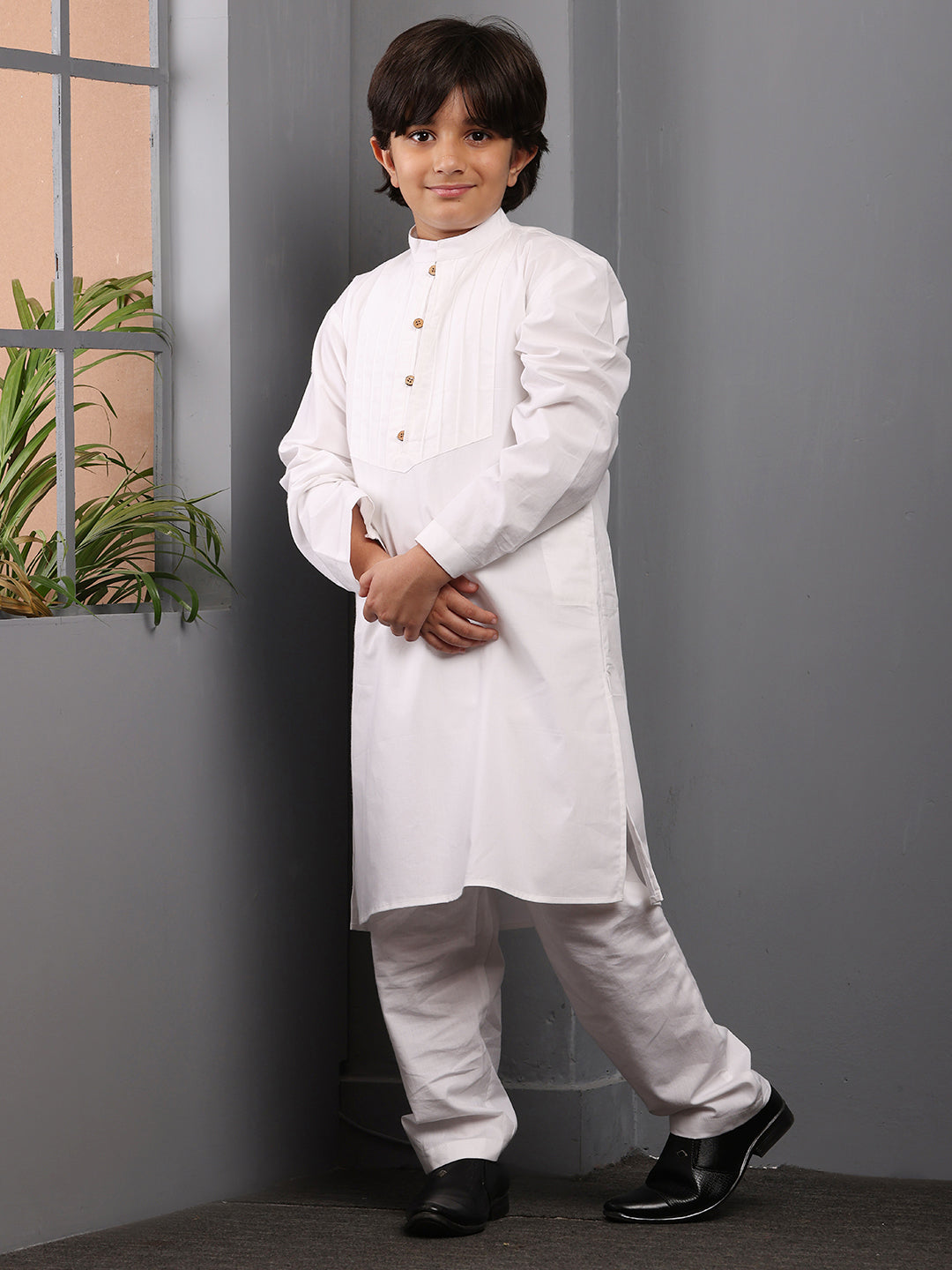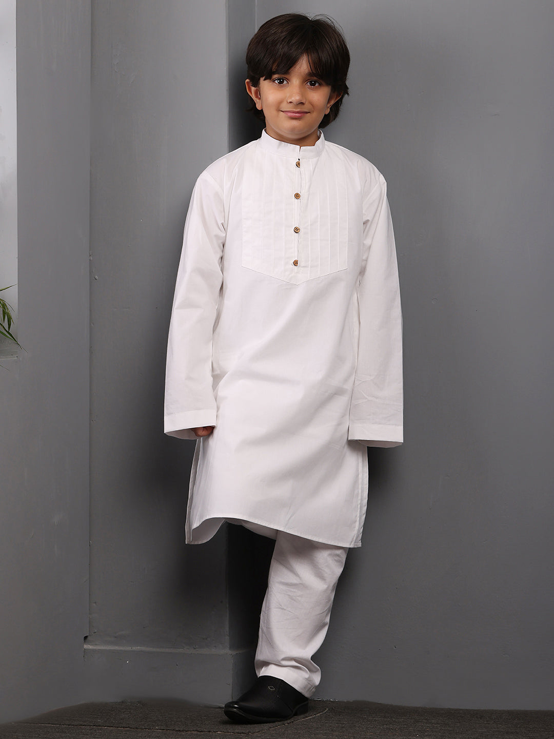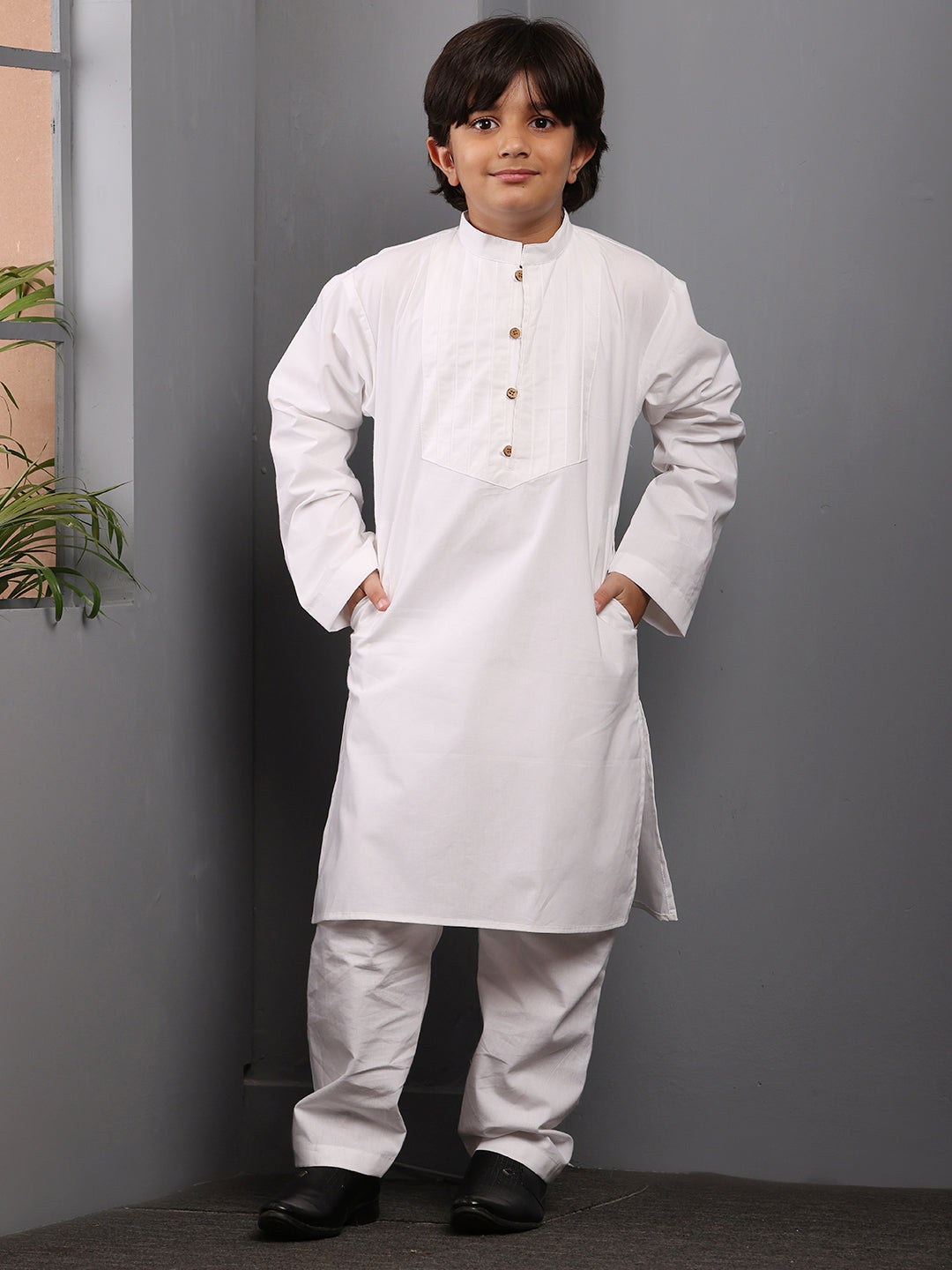 This boys' white kurta and pajama set combines simplicity with elegance. Made from soft cotton, the kurta features long sleeves, a four-button front closure, and convenient side pockets. Paired with an elasticated white pajama, this modest ensemble is designed for both style and comfort, perfect for any occasion with a fresh, timeless look.