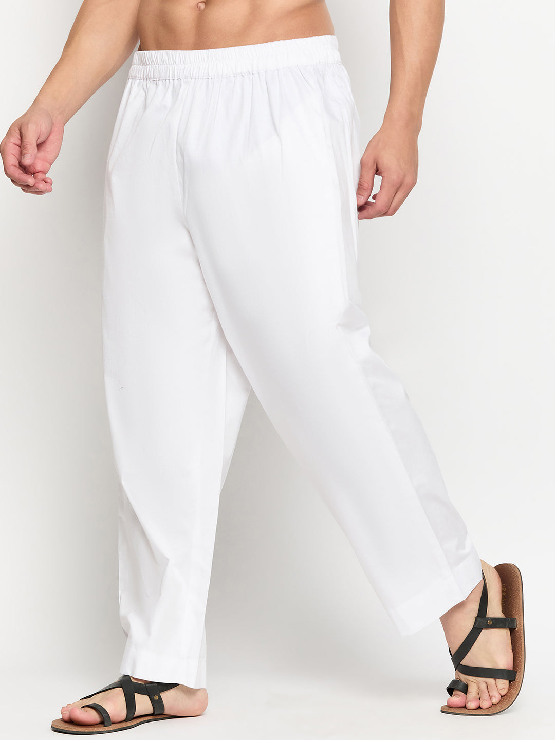 Men's full-length white pyjamas, crafted from soft cotton fabric for casual use. Featuring an elasticated waistband and slip-on closure for comfort and ease. The classic design ensures a relaxed fit, perfect for lounging and sleeping. Durable and breathable, these pyjamas are a wardrobe essential for everyday comfort.
