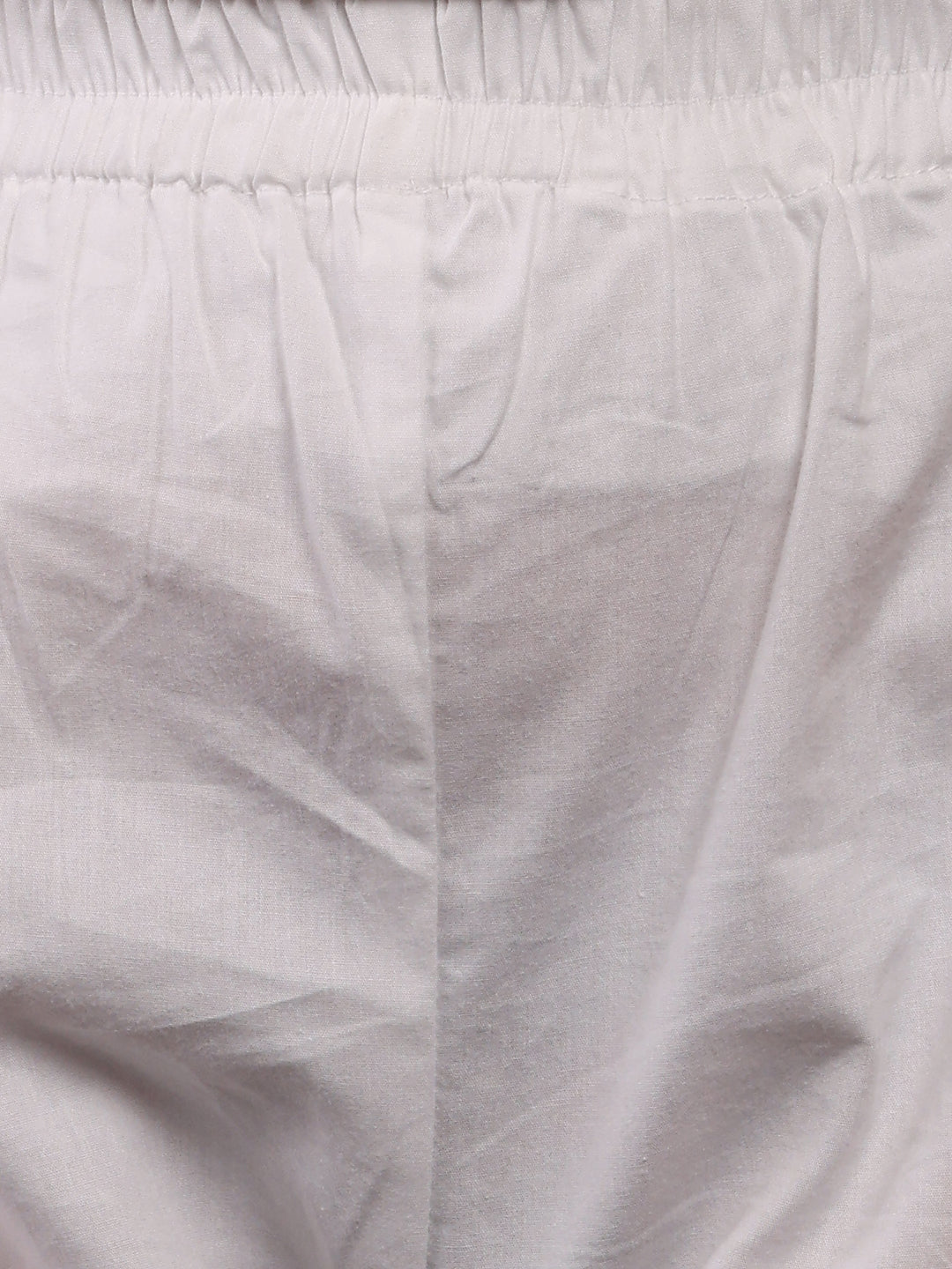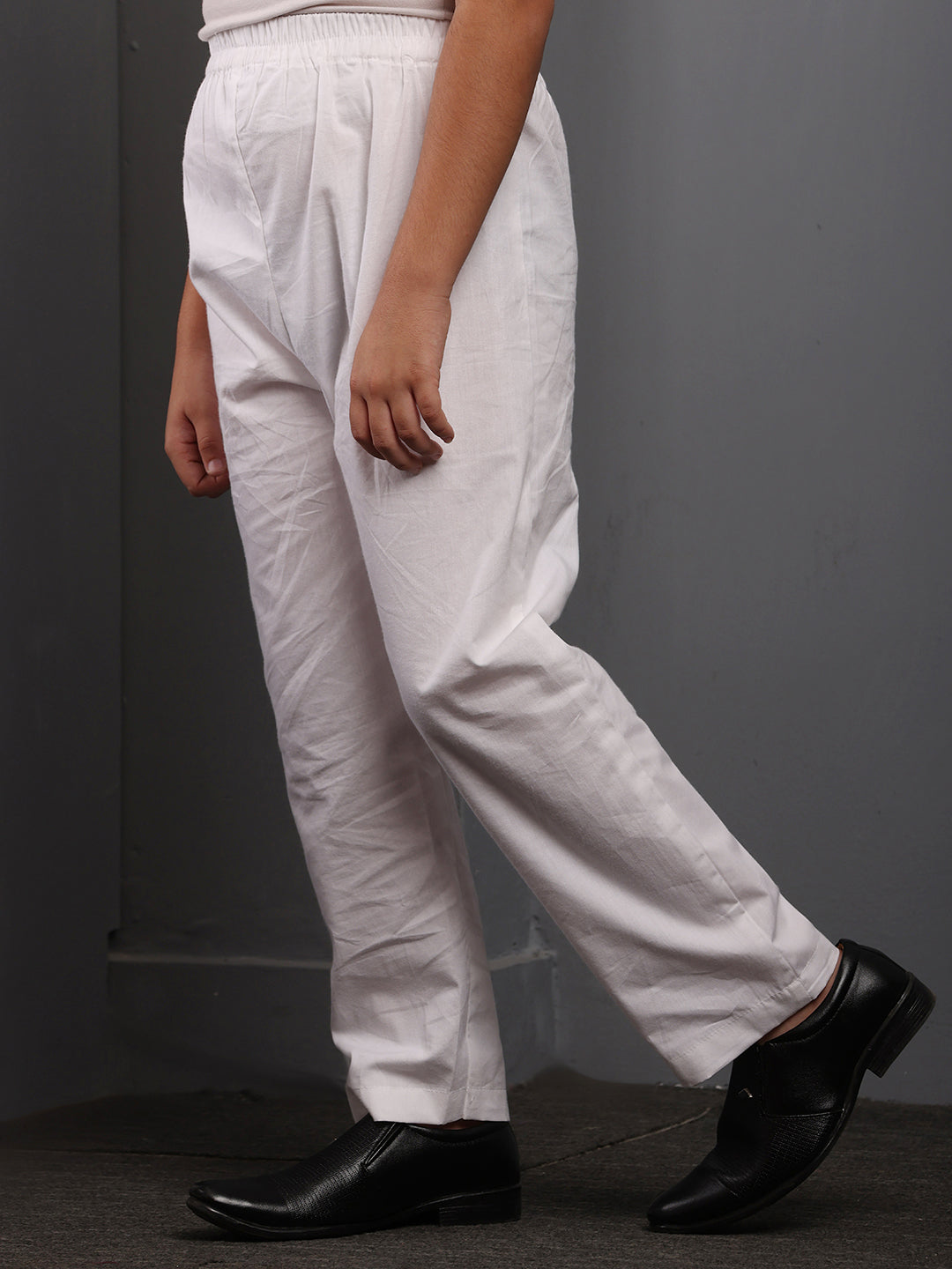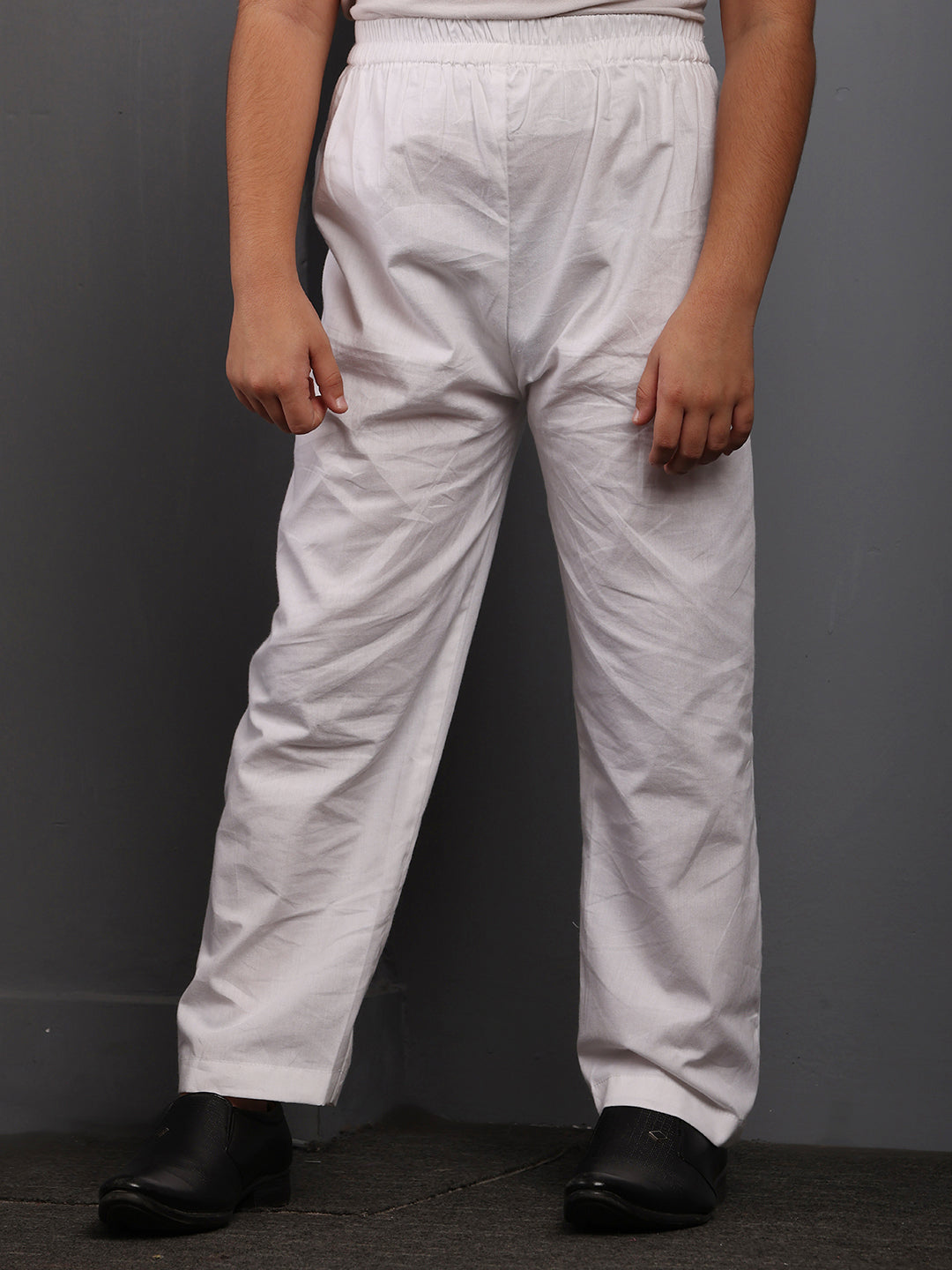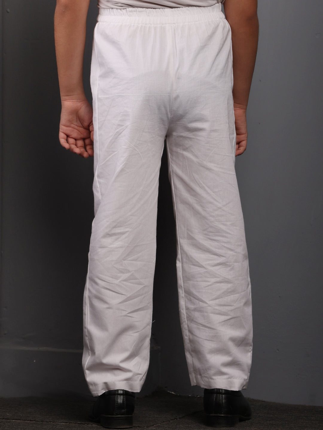 Boy's full-length white pajamas, crafted from soft cotton fabric for casual use. Featuring an elasticated waistband and slip-on closure for comfort and ease. The classic design ensures a relaxed fit, perfect for lounging and sleeping. Durable and breathable, these pyjamas are a wardrobe essential for everyday comfort.
