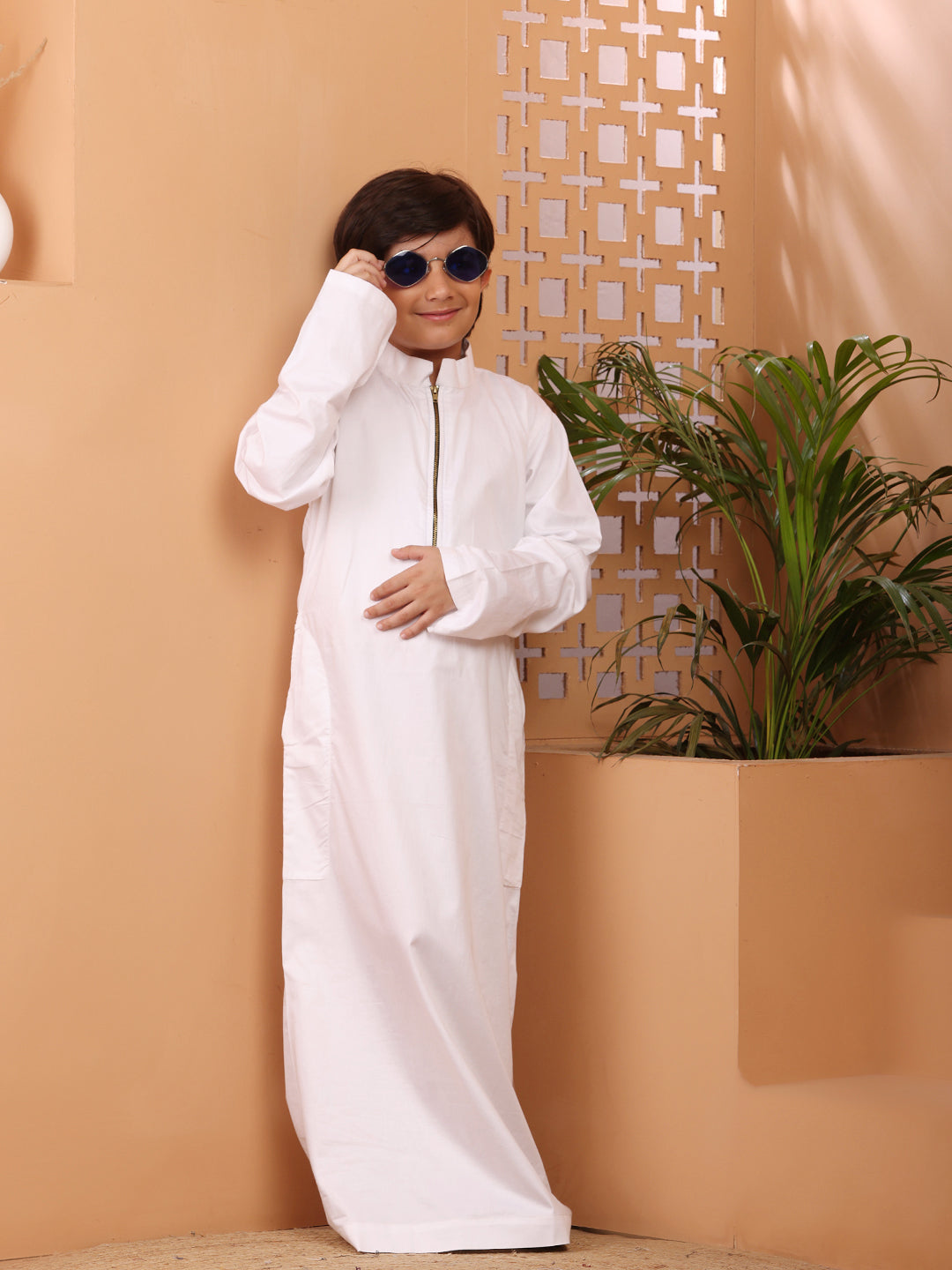 This elegant white thobe, crafted for Islamic and Muslim boys, combines tradition with modern style. Made from soft cotton fabric, it ensures comfort and breathability, while both side pockets add practical convenience. Perfect for any occasion, this classic piece offers a refined and charismatic look, making it an ideal choice for boys seeking both charm and simplicity.