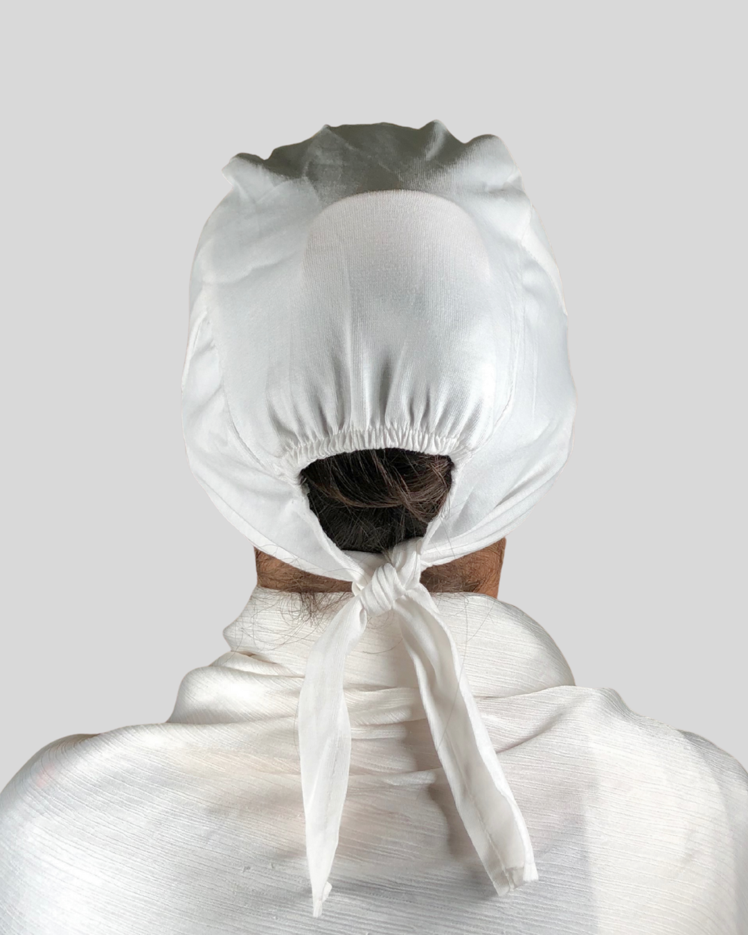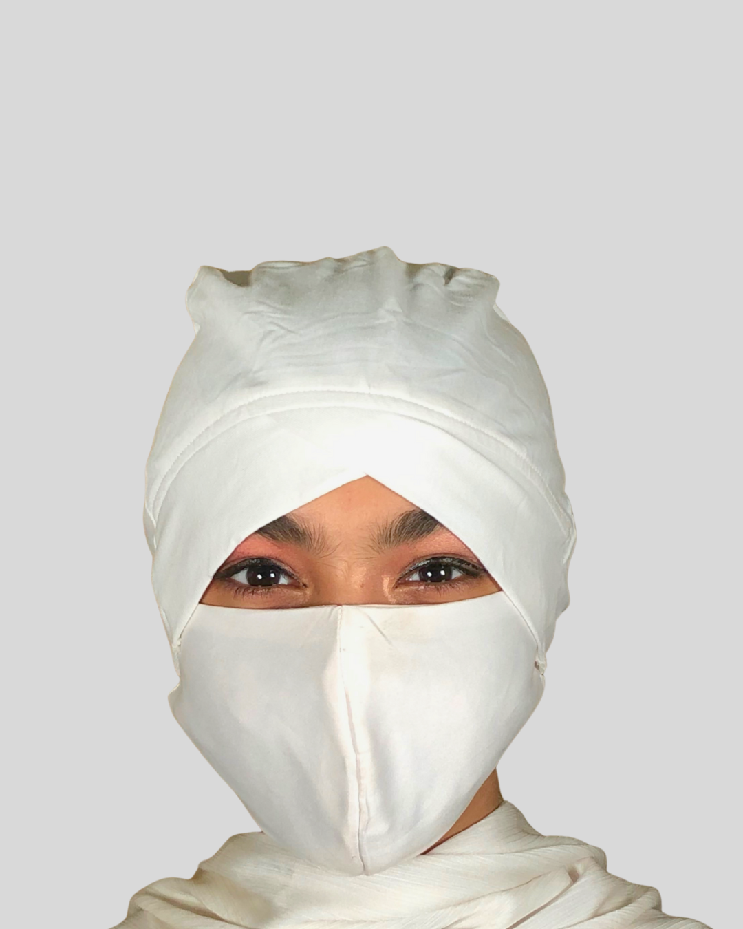 This plain white full undercap is made from soft, breathable, and stretchable fabric for all-day comfort. Designed in a turban style, it offers modesty and protection while ensuring a secure fit. Perfect for wearing under hijabs, it provides complete coverage for hair, forehead, and face, keeping everything in place throughout the day.
