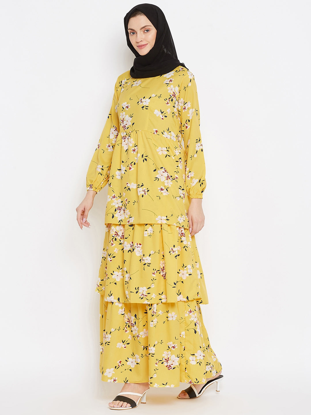 With this three frill yellow floral print abaya, you're embracing a blend of modern style and timeless beauty, making it a must-have addition to your wardrobe from Nabia. For an added touch of elegance, pair it with one of our georgette hijabs, allowing you to carry a bold and confident look wherever your journey takes you.
