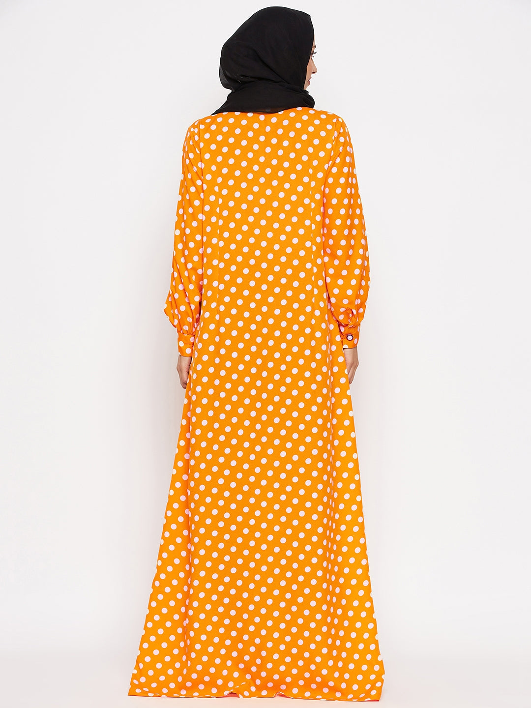 Yellow Polka Design Abaya for Women, by Nabia, offers a modest and stylish choice for Muslim women. With long sleeves, full-length coverage, and an A-line silhouette, it combines Islamic values with contemporary fashion. Crafted from high-quality Crepe Fabric with a striking yellow polka design, it features two patch pockets for added functionality. This Abaya allows women to express their faith with elegance and practicality.