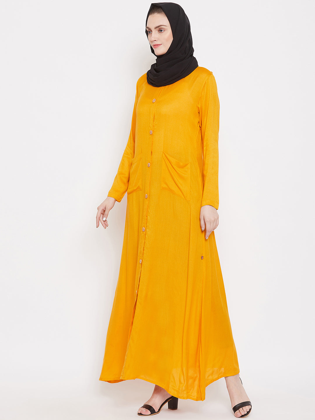 Nabia's Yellow Front Open Abaya for women is a graceful choice in Rayon fabric. Featuring a front button closure for added elegance, it also includes two practical patch pockets, making it a perfect blend of style and functionality. This abaya is ideal for modern Muslim women seeking both modesty and convenience.