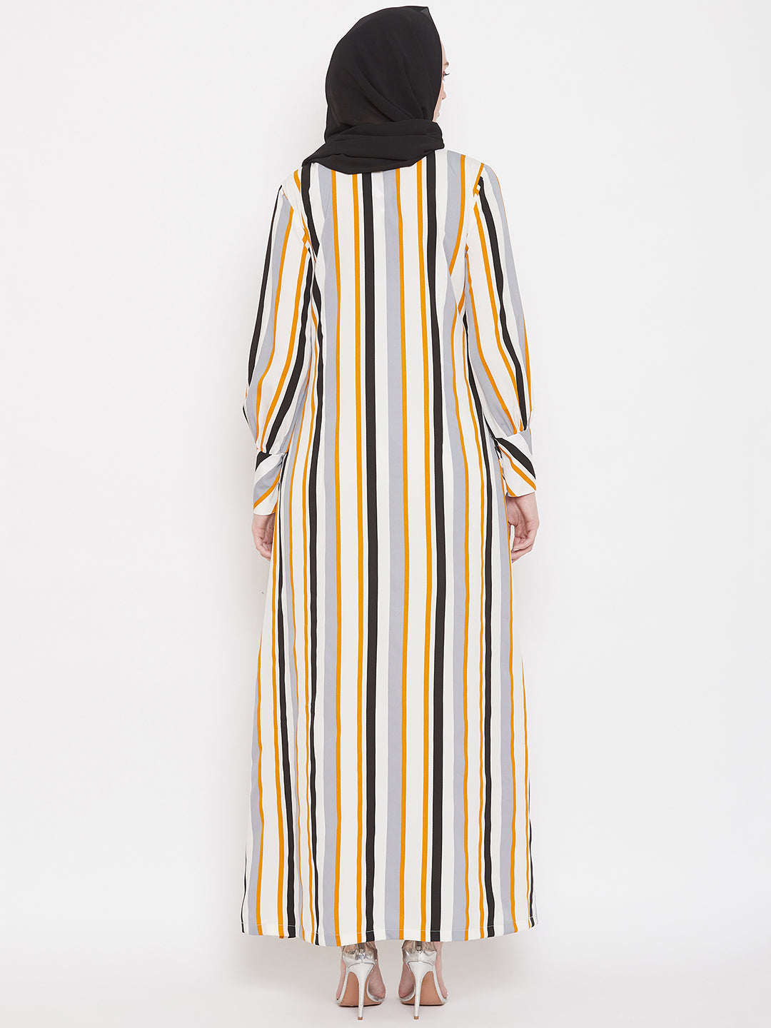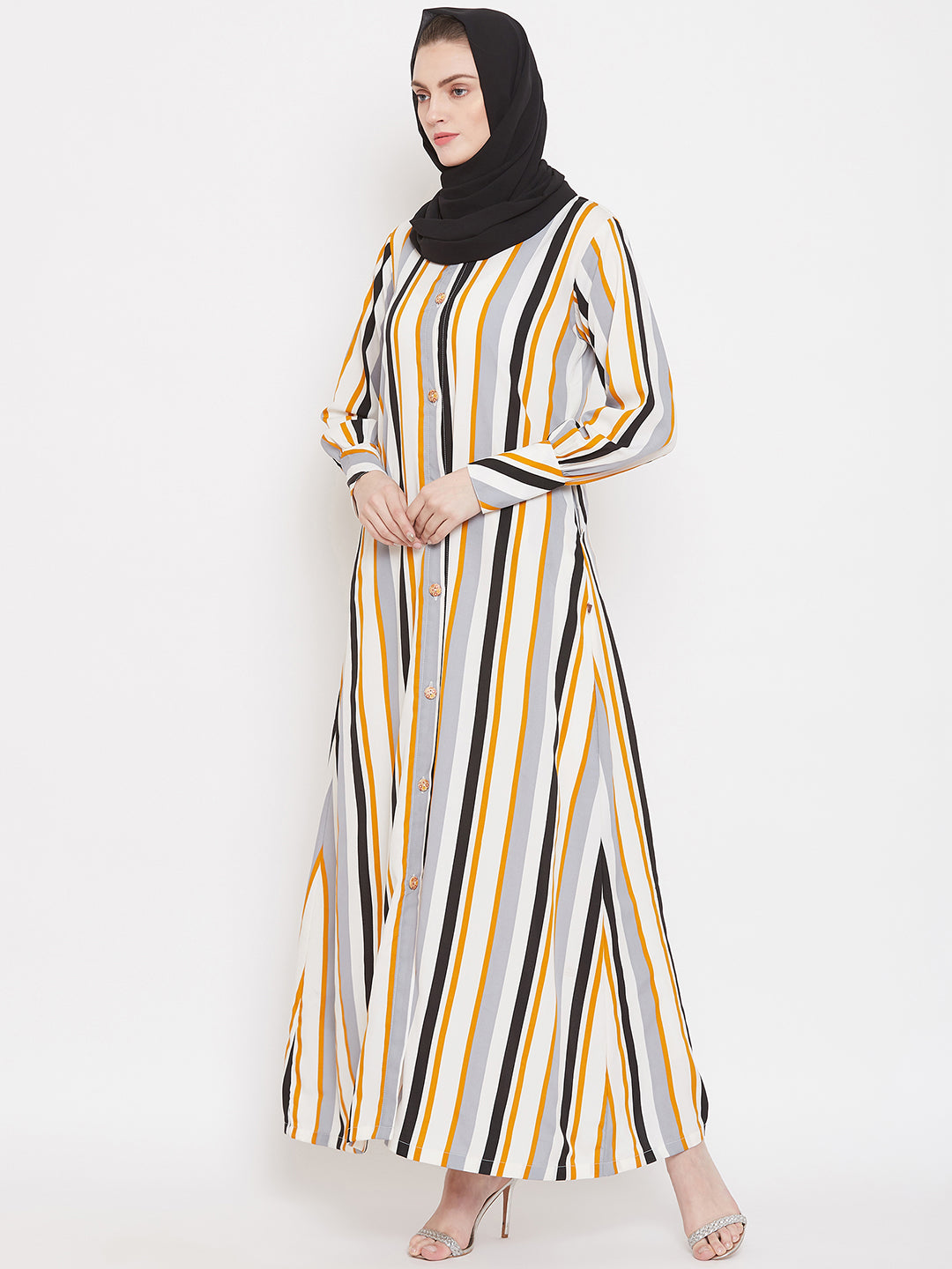 Stripes can never go out of trend. Nabia has a striped abaya design that is very highly appreciated that allows you to make a fashion statement wherever you go. This Yellow and white daily wear front open side pocket Abaya dress is an enduring addition to your wardrobe collection.