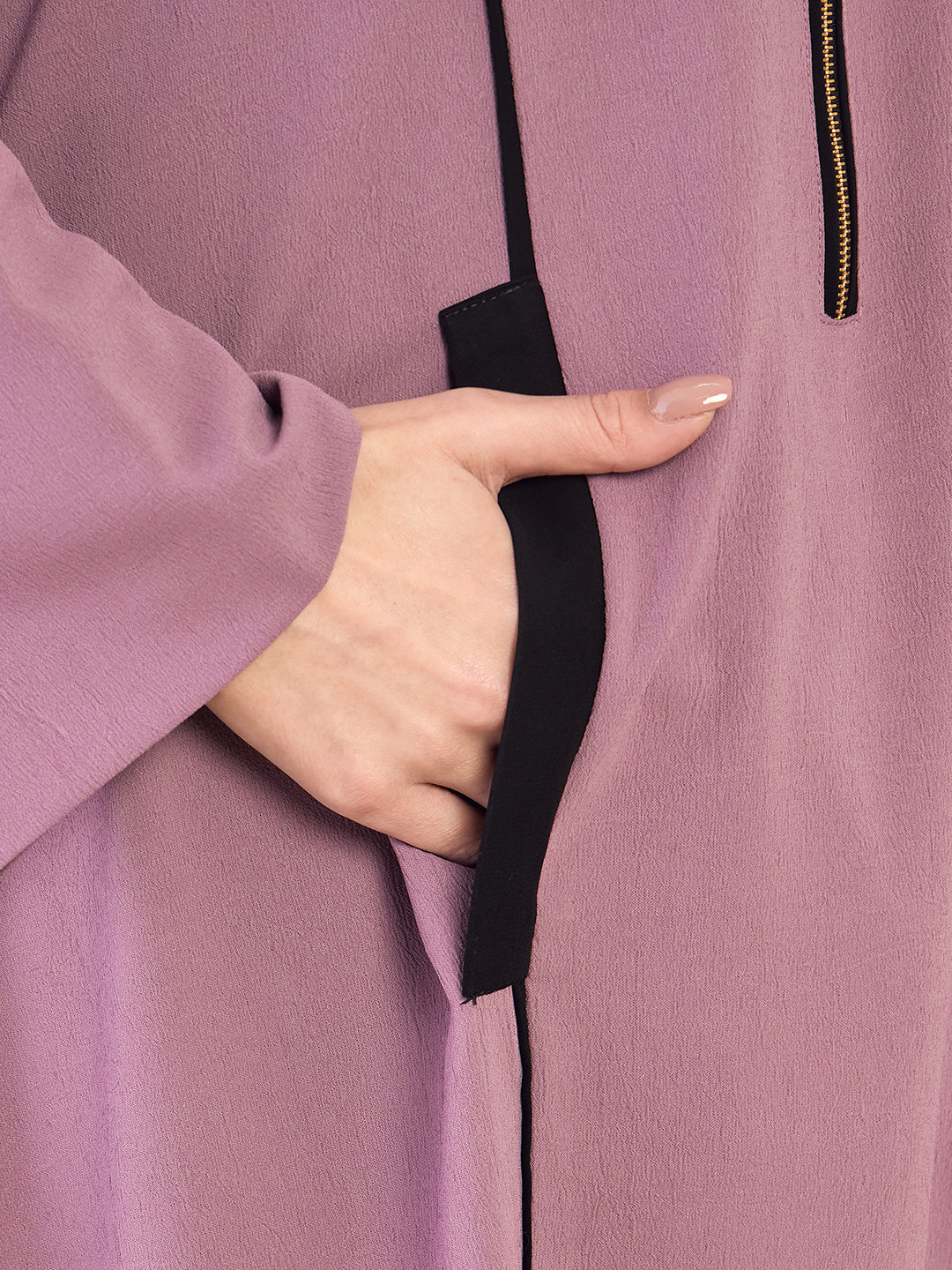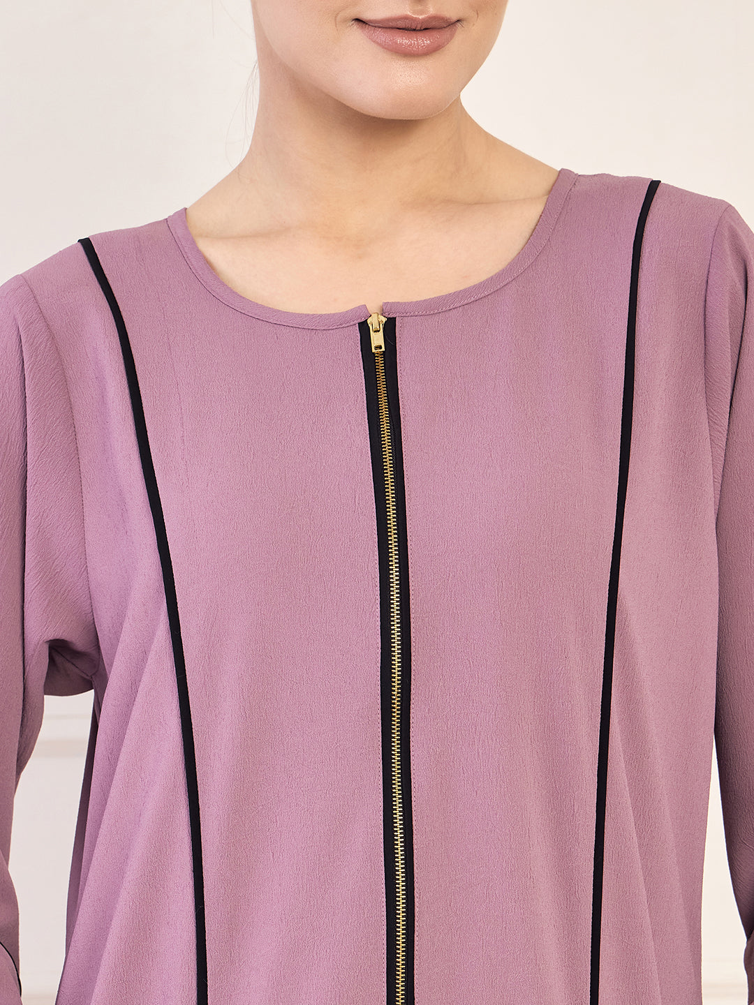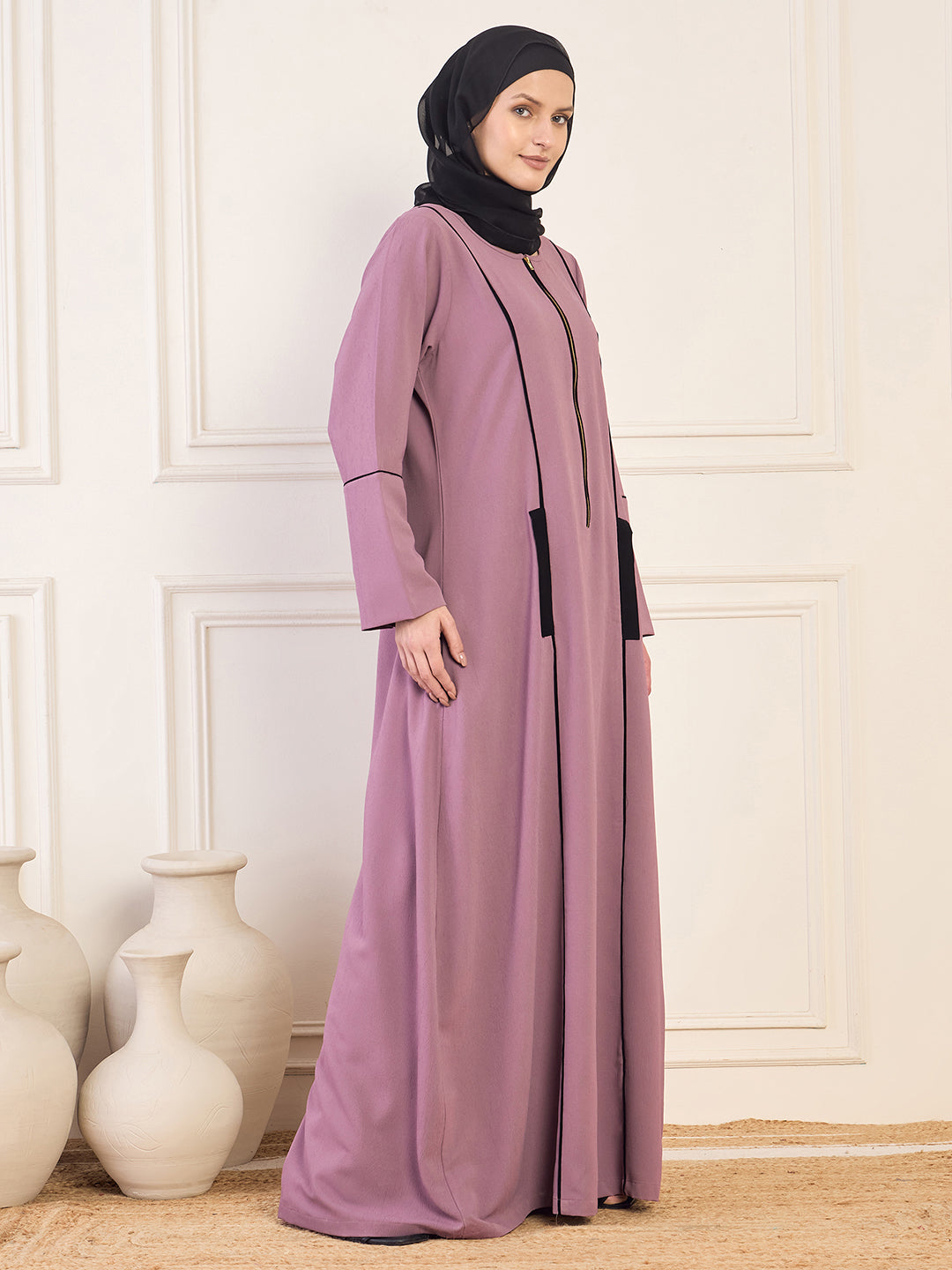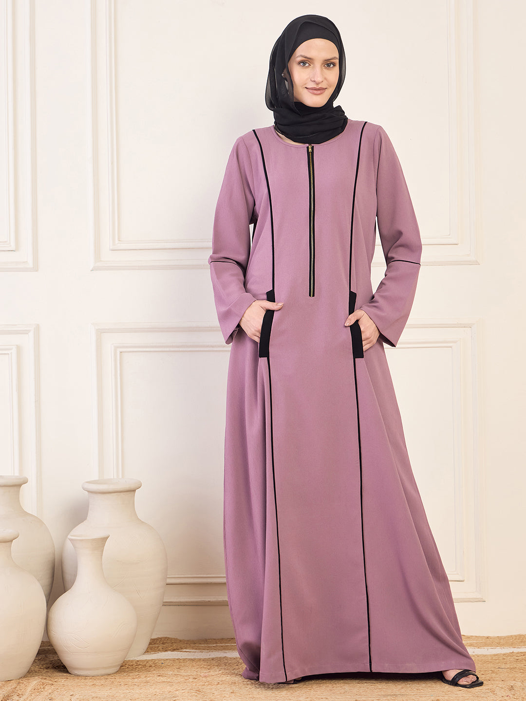 The pink solid abaya is a perfect combination of elegance and modesty for Muslim women. Crafted from premium CY Crush fabric, it features a chic round neck, practical zip closure, and stylish black piping for an added touch of refinement. Ideal for any occasion, this abaya ensures unmatched comfort and timeless appeal. A versatile piece for modern modest fashion, it offers grace and sophistication, making it an essential addition to your wardrobe.